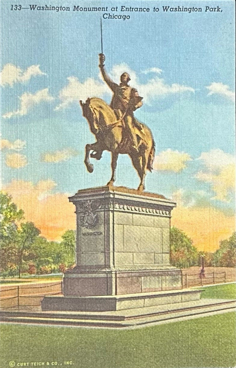 Washington Monument - Entrance to Washington Park - Chicago, Illinois - 1940s Linen Postcard