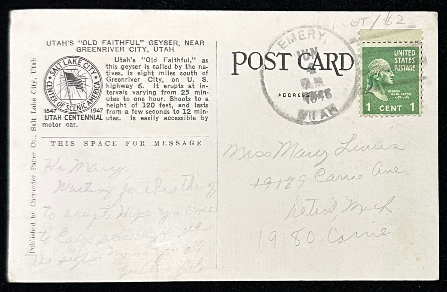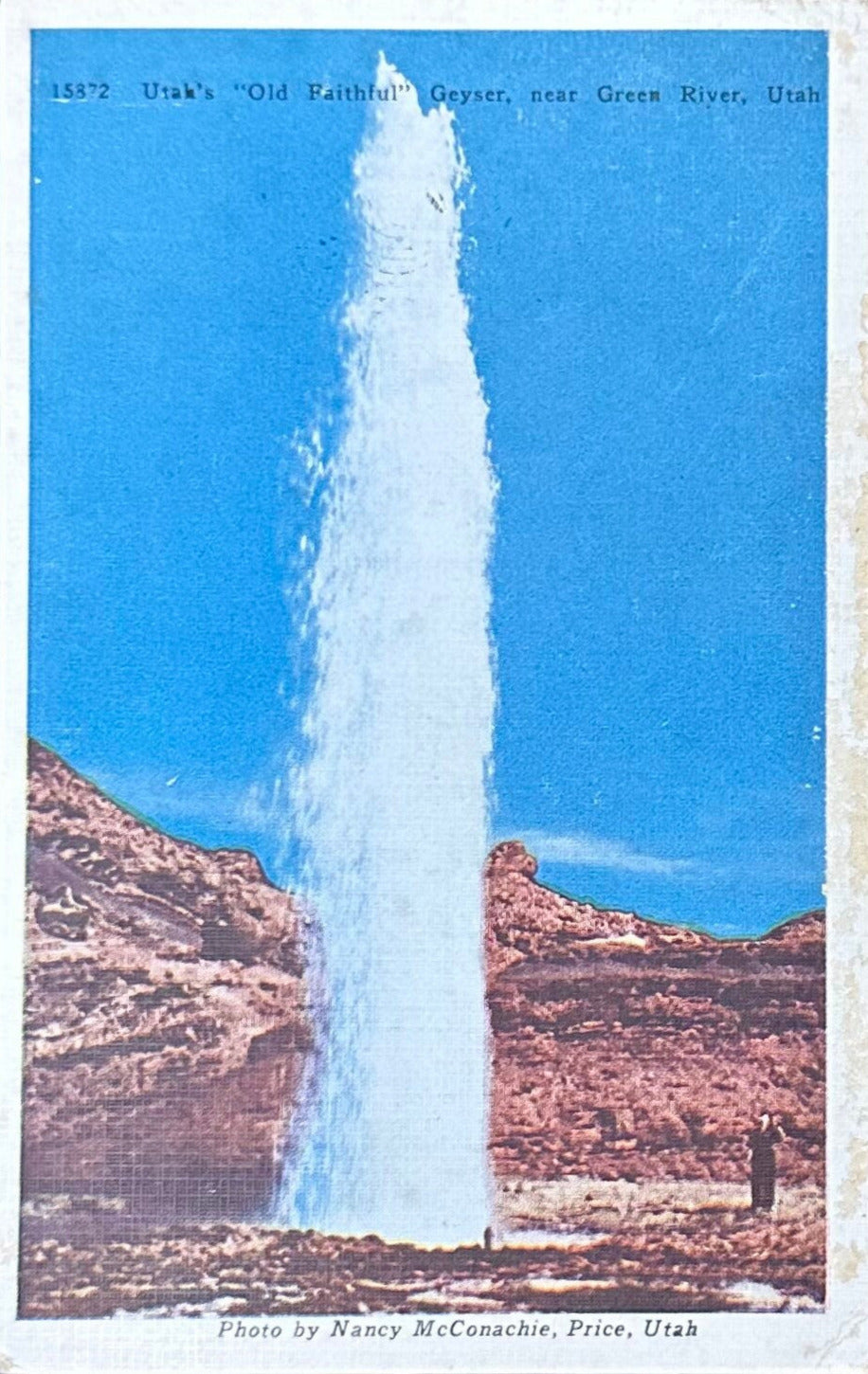 Back Information: Utah’s “Old Faithful” Geyser, near Green River City, Utah. Utah’s “Old Faithful,” as this geyser is called by the natives, is eight miles south of Greenriver City,on U.S. Highway 6. It erupts at intervals varying from 25 minutes to one hour. Shoots to a height of 120 feet, and lasts from a few seconds to 12 minutes. Is easily accessible by motor car.