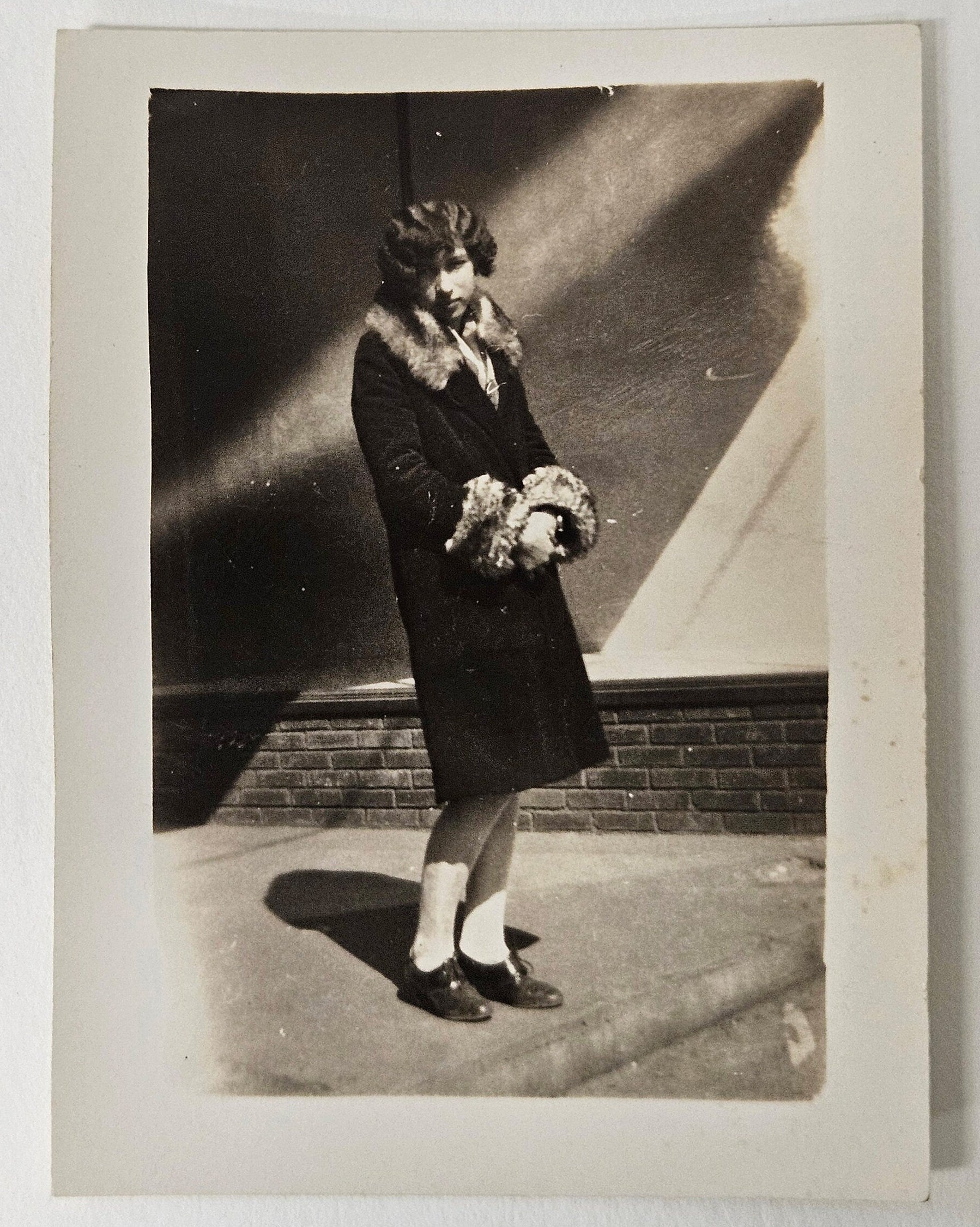1928 Black and White Photo of Young Girl "Anna" wearing a Fashionable Fur trimmed Coat and sporting a 1920s Short Wavy Hairstyle. This photo exudes a Childlike Innocence. and the sunlight on the wall, behind Anna, is perfect. This was taken between between WWI and WWII, a time of prosperity and hope in the United States. This was originally a RPPC but some one kept only the photo.