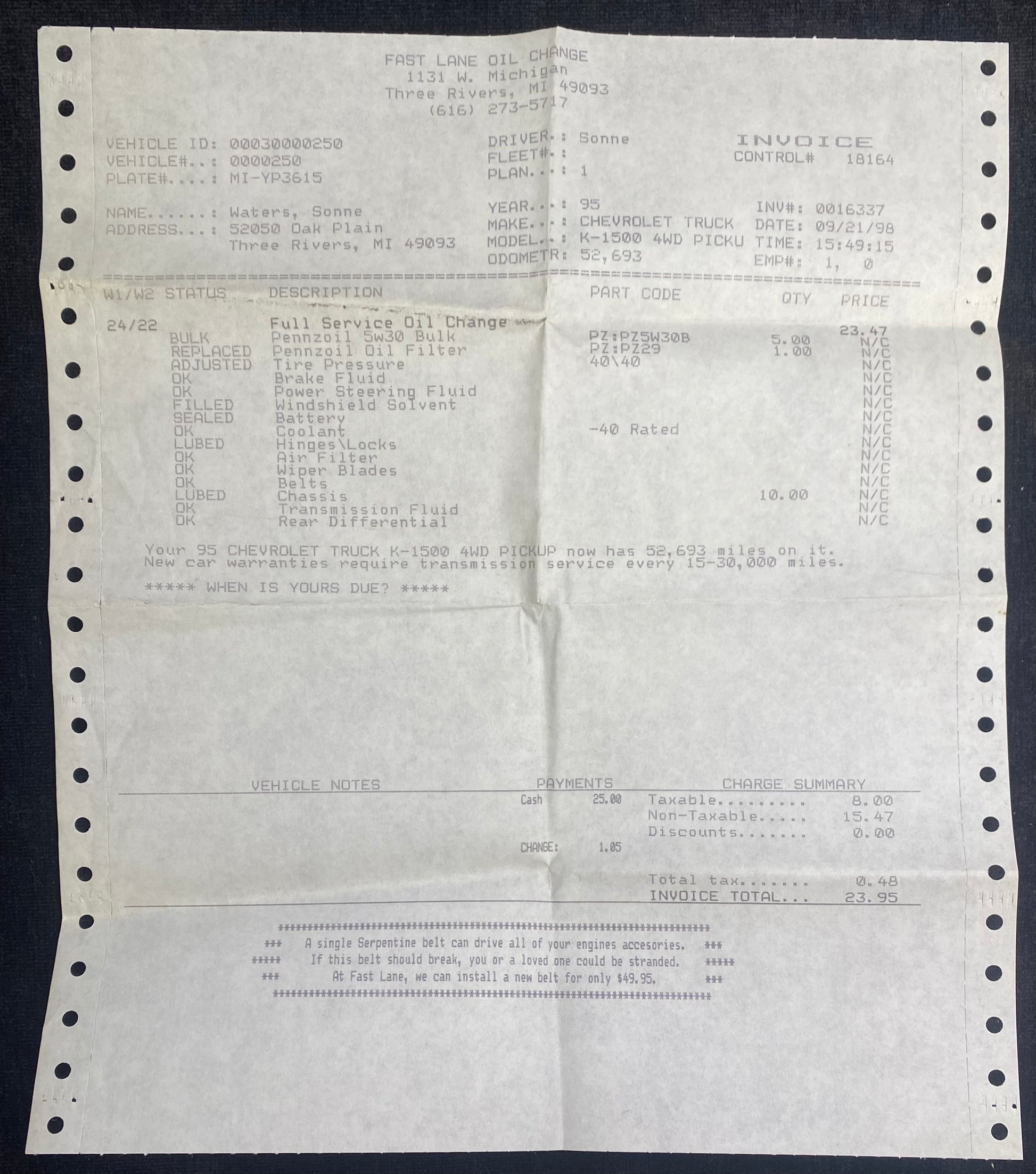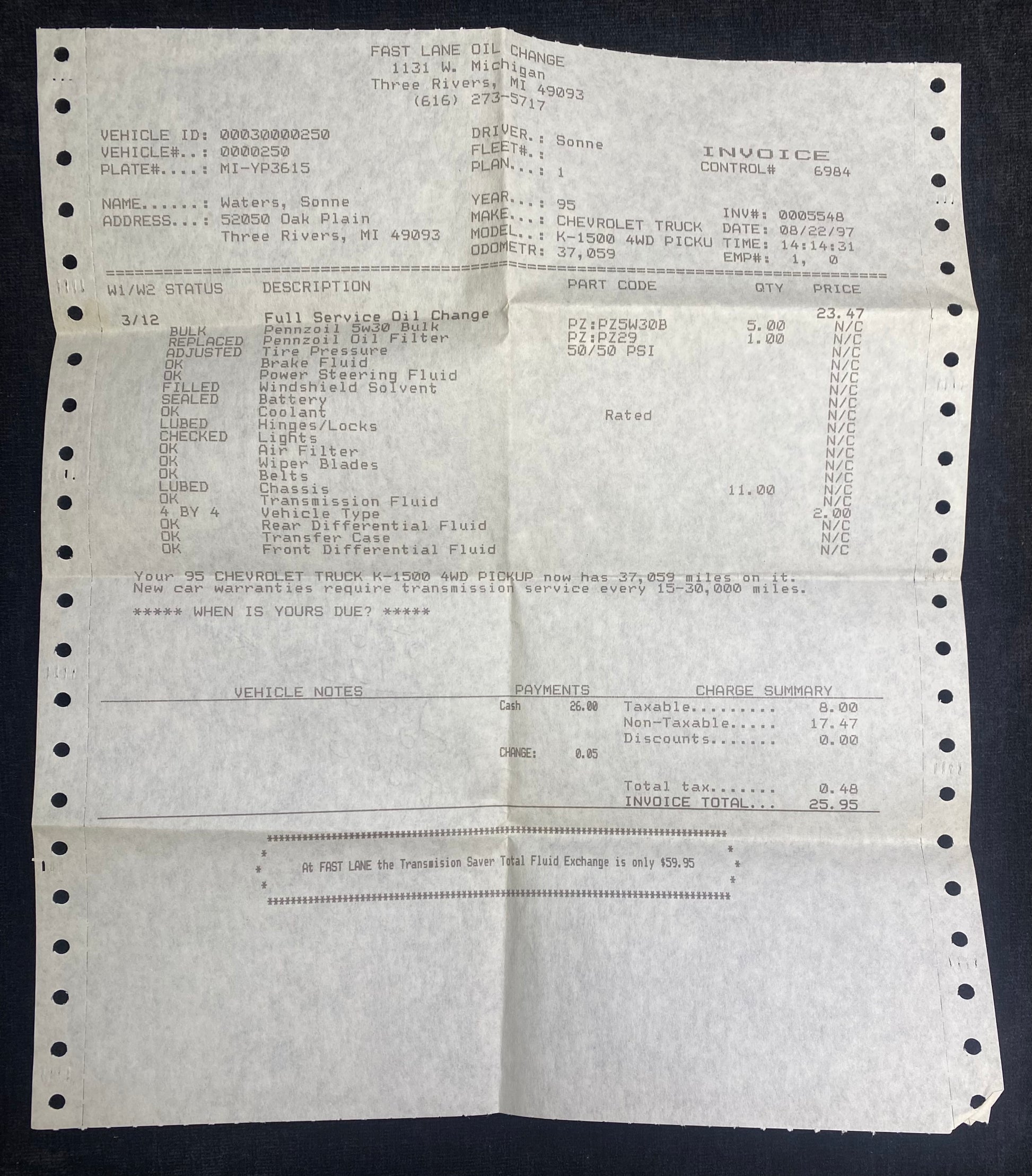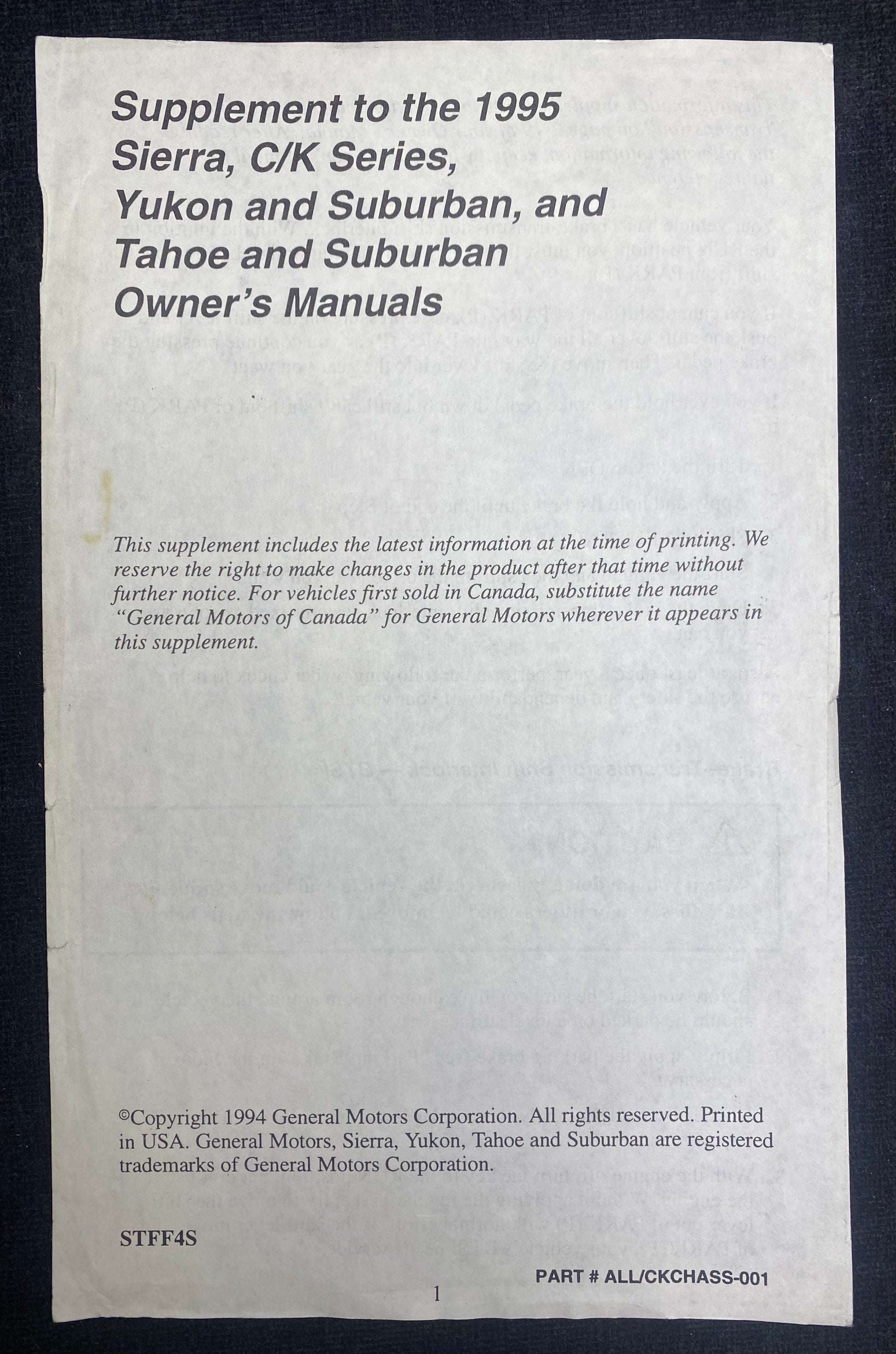This 1995 Owner's Manual provides information on how to operate and maintain the vehicle, including details on features, controls, and troubleshooting. It also covers safety information, maintenance schedules, and customer assistance contacts. It is in great condition with the inside cover pocket bent, slight creasing on the cover and spine, and two small tears on the back cover near the spine - one from the top, one from the bottom. This manual comes with five receipts from the previous owner depicting oil changes, transmission flushes, and other maintenance done on the vehicle. All receipts are from before 2000 - Tuffy receipt year cannot be made out. Manual also comes with "Supplement to the 1995 Sierra, C/K Series, Yukon and Suburban, and Tahoe and Suburban Owner's Manual" first page, as this came with the manual.
