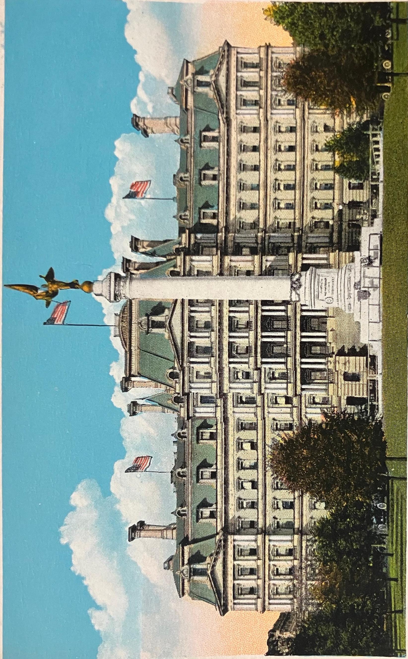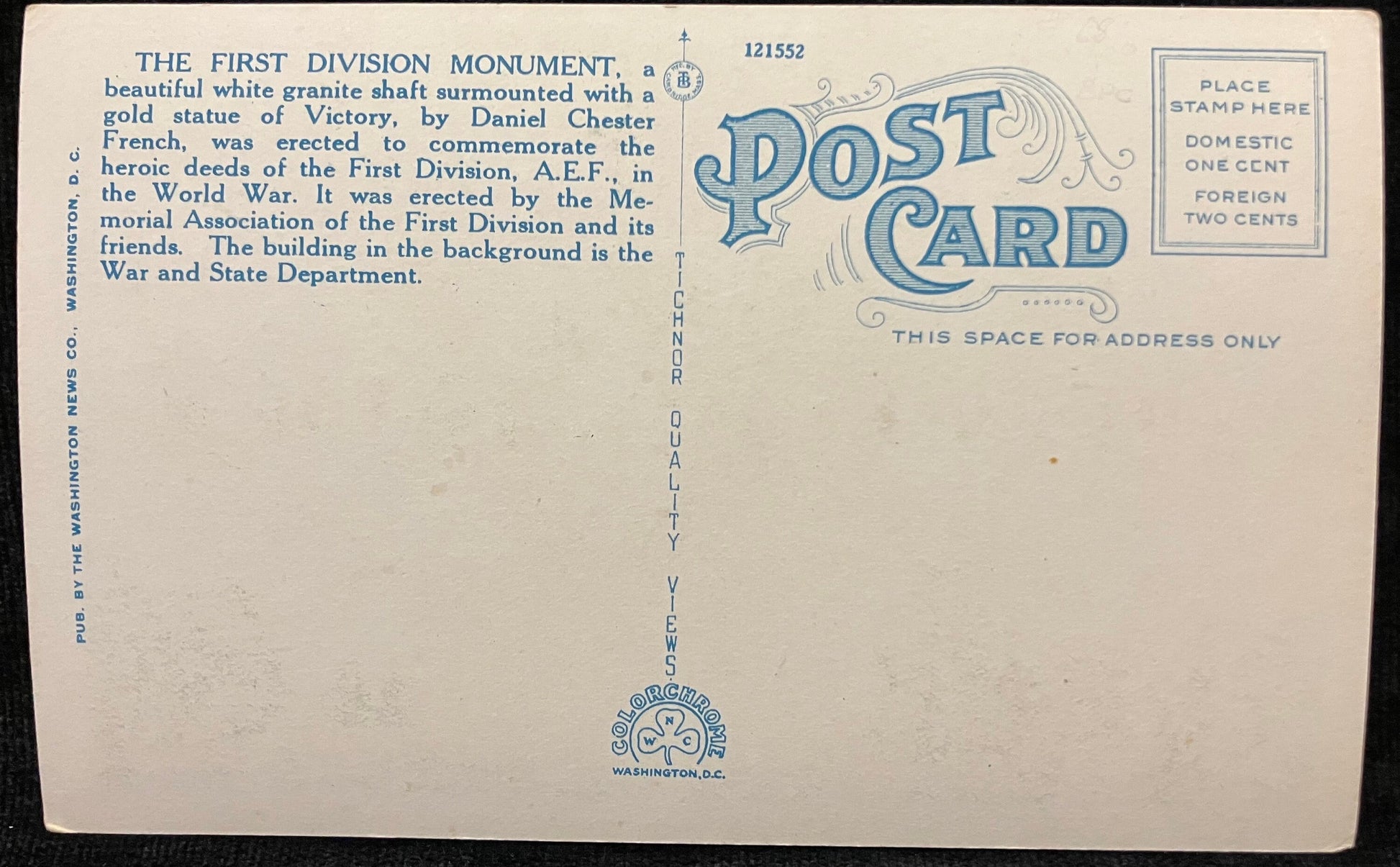 Back: THE FIRST DIVISION MOMENT, a beautiful white granite shaft surmounted with a gold statue of Victory, by Daniel Chester French, was erected to commemorate the heroic deeds of the First Division, A.E.F., in the World War. It was erected by the Memorial Association of the First Division and its friends. The building in the background is the War and State Department.