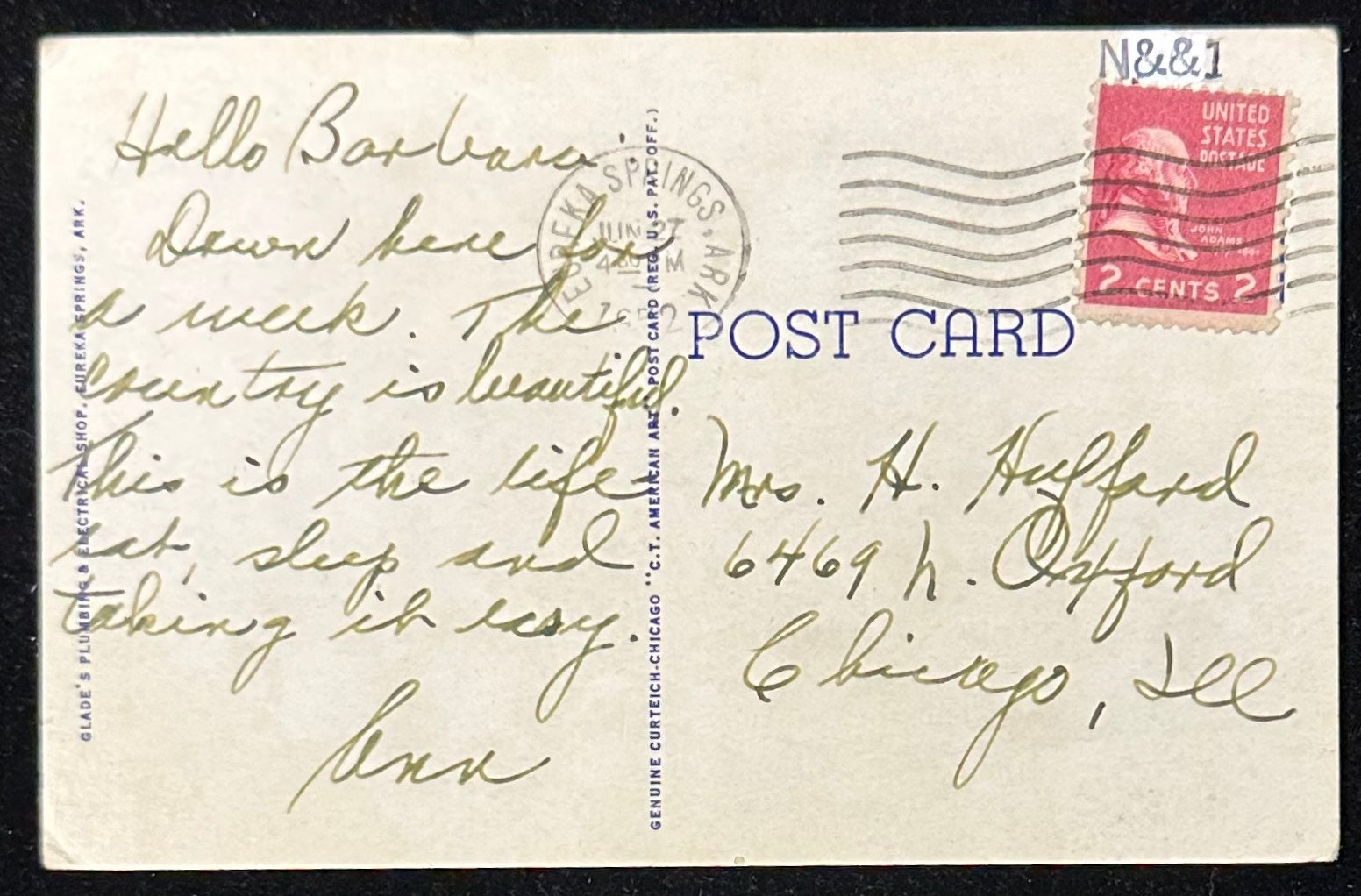 Mailed: Posted on June 27, 1952 from Eureka Springs, Arkansas with a 2 cent Carmine John Adams stamp.
