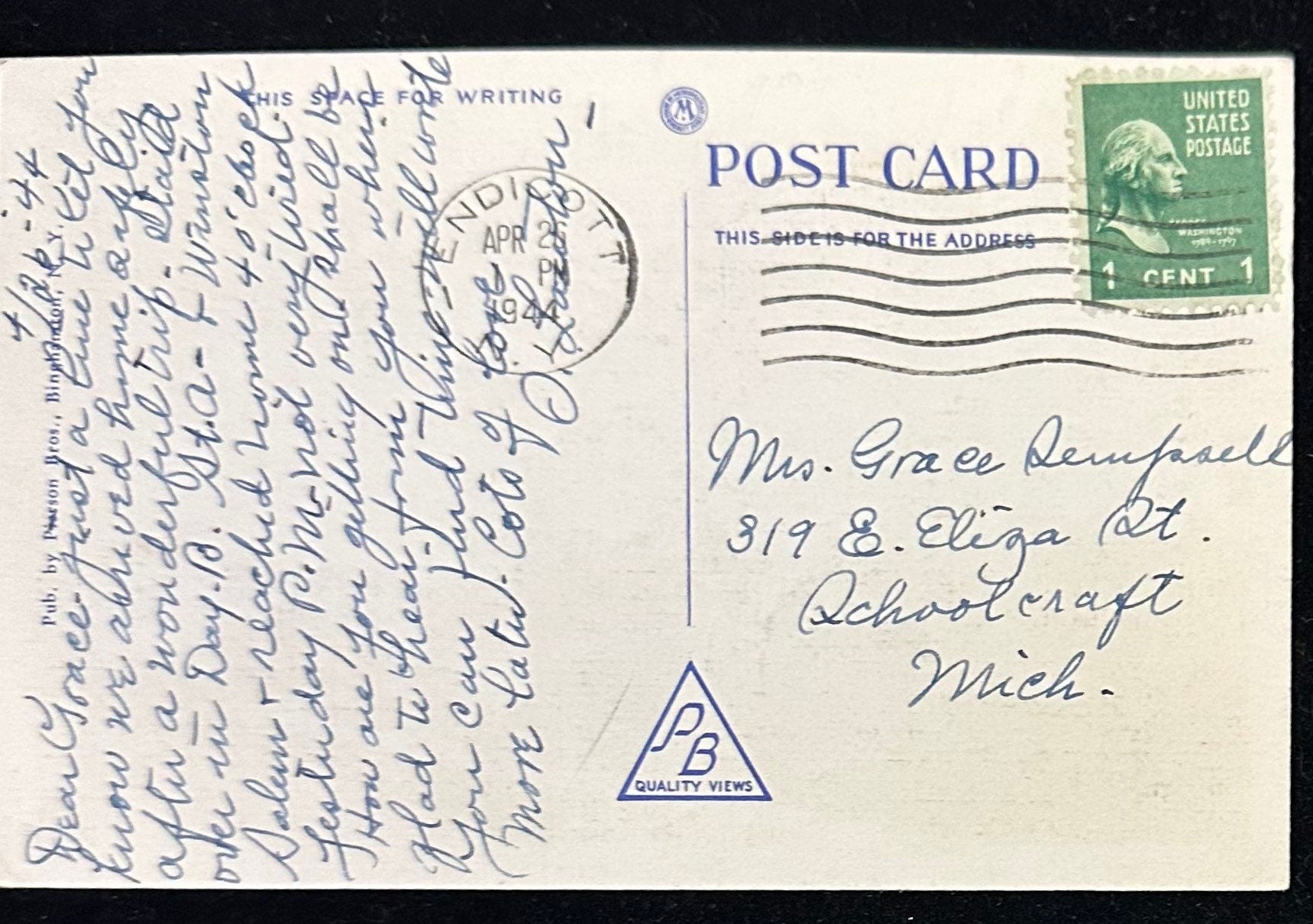 Mailed: Posted on April 25th, 1944 from Endicott, New York with a green 1 cent George Washington stamp
