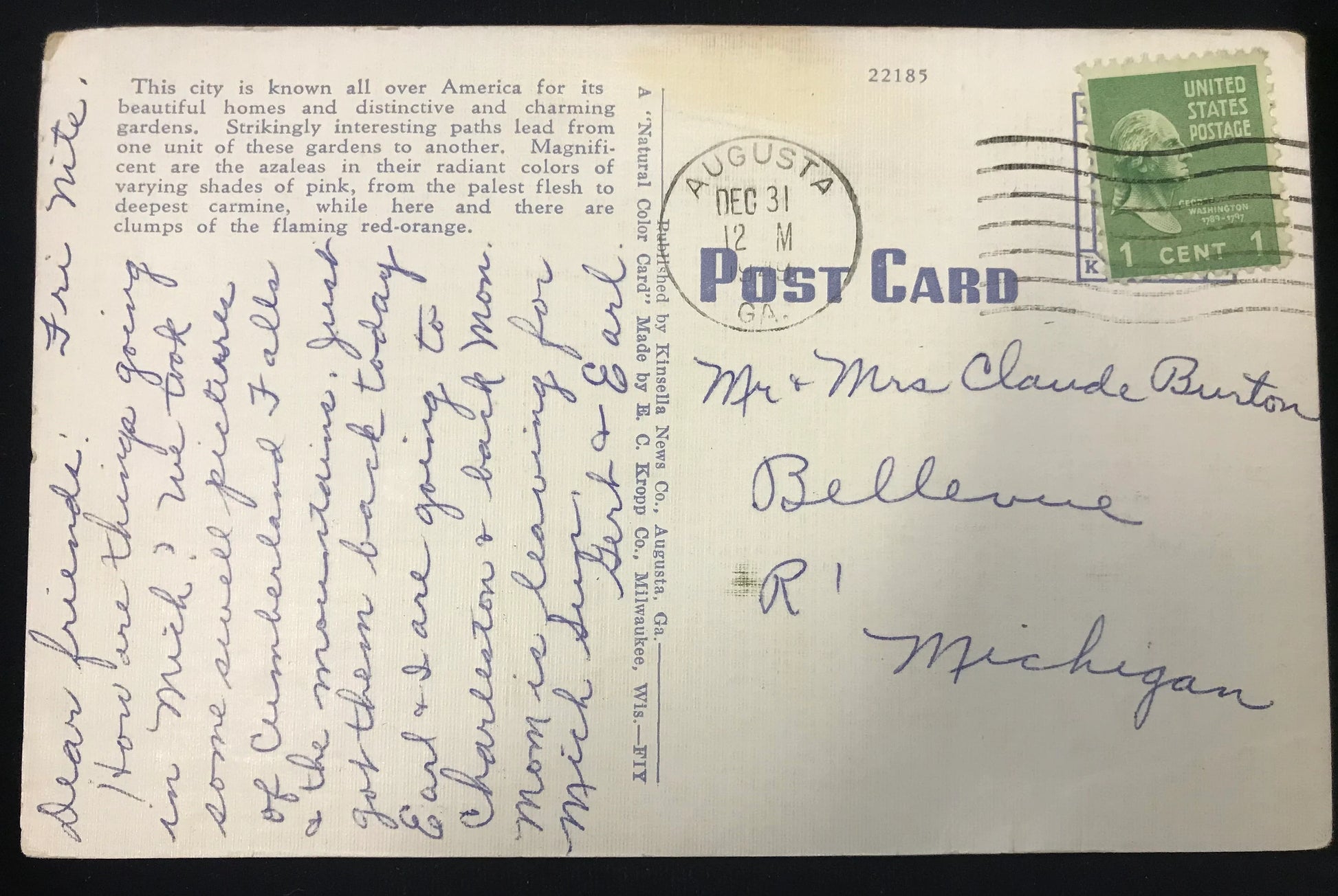 Back information: "This city is known all over America for its beautiful homes and distinctive and charming gardens. Strikingly interesting paths lead from one unit of these gardens to another. Magnificent are the azaleas in their radiant colors of varying shades of pink, from the palest flesh to deepest carmine, while here and there are clumps of the flaming red-orange."