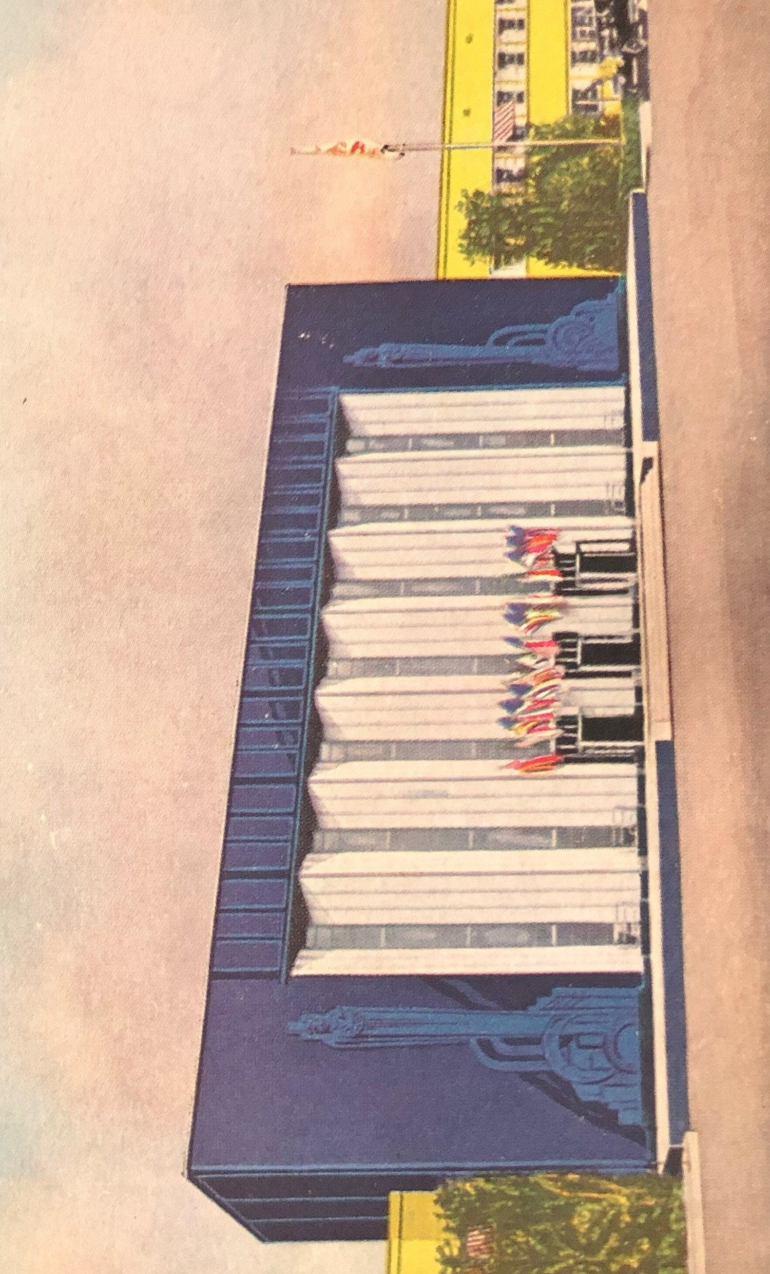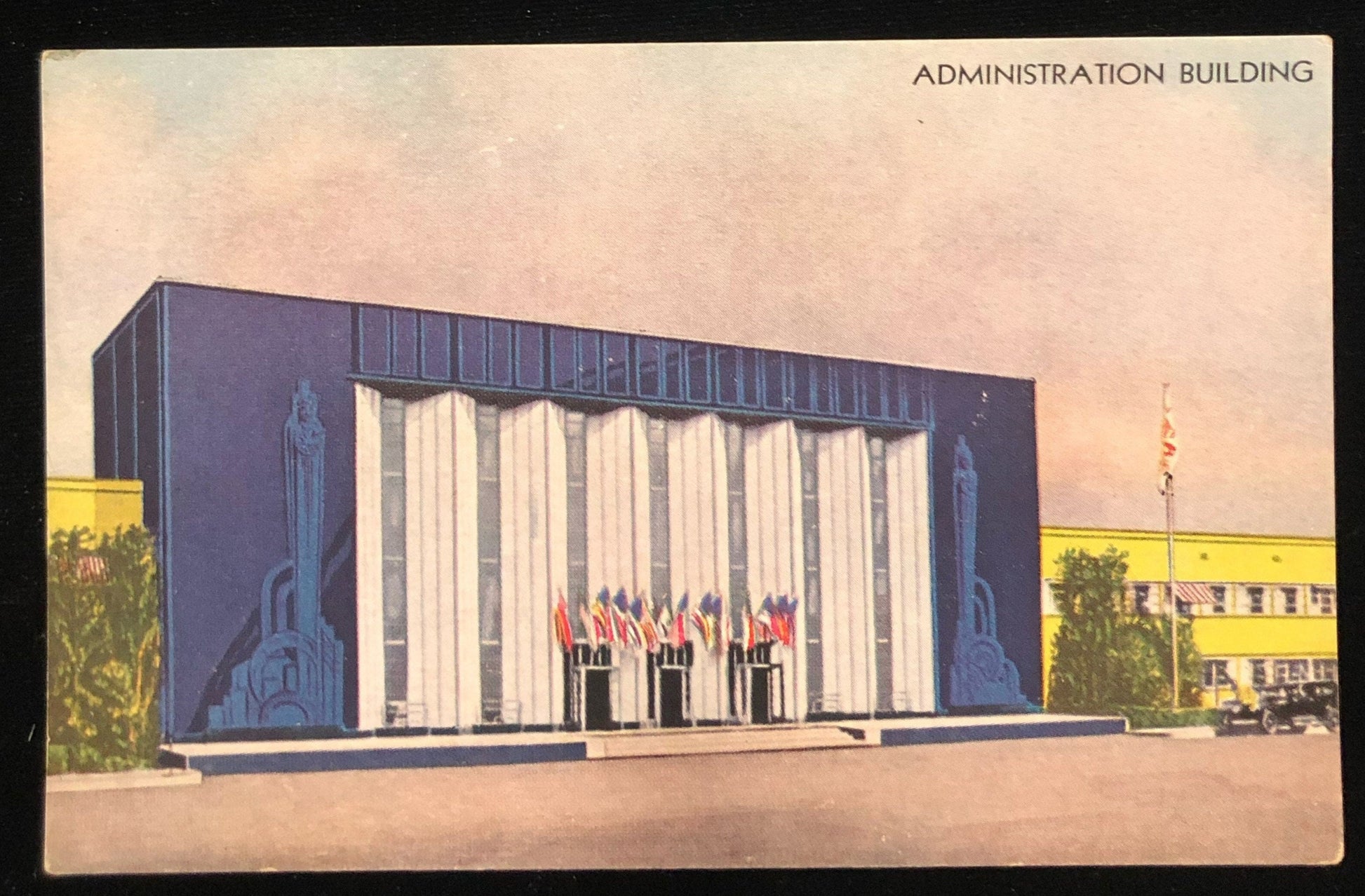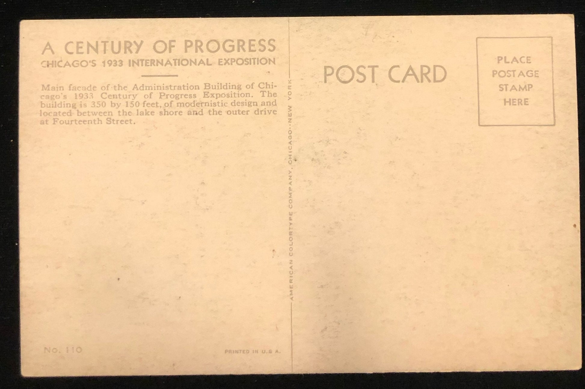 Main facade of the Administration Building of Chicago's 1933 Century of Progress Exposition. The building is 350 by 150 feet of modernistic design and located between the lake shore and the outer drive at fourteenth street." No. 110
