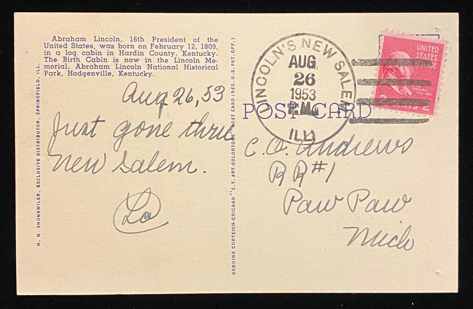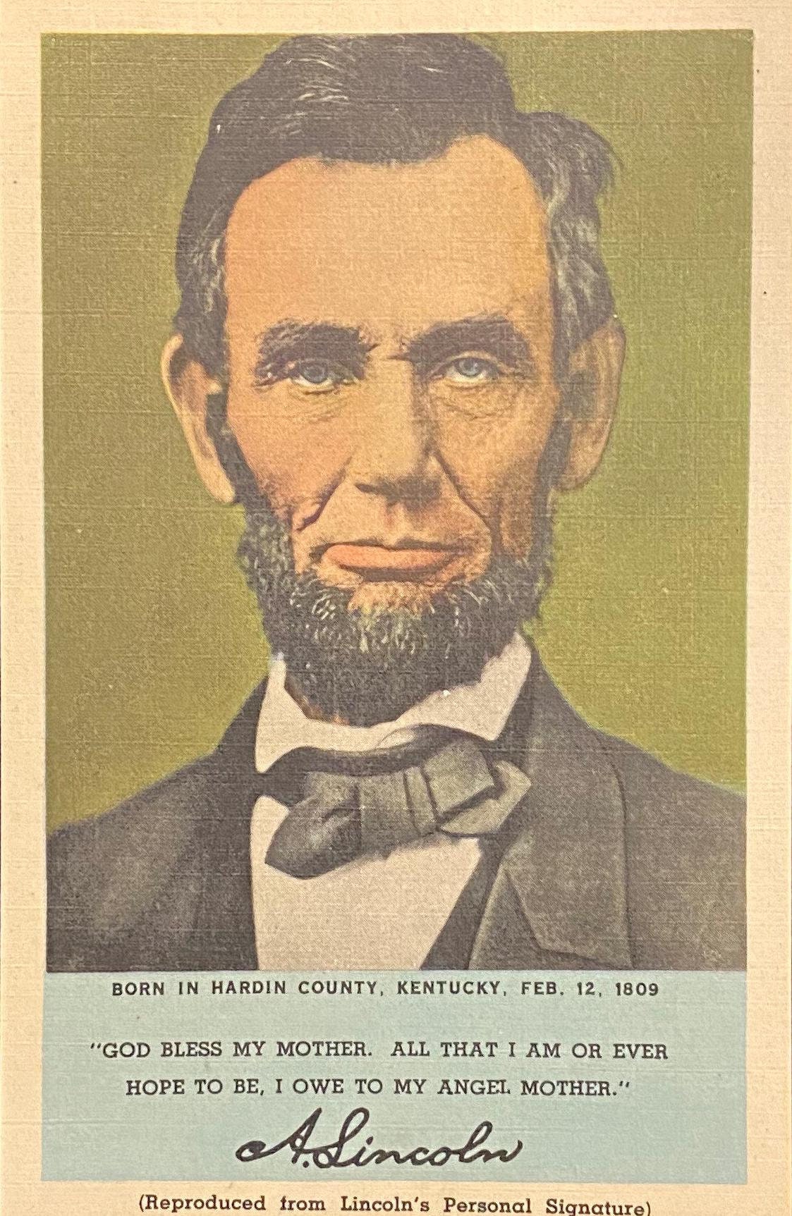 Back: "Abraham Lincoln, 16th President of the United States, was born on February 12, 1809, in a log cabin in Hardin County, Kentucky. The Birth Cabin is now in the Lincoln Memorial, Abraham Lincoln National Historical Park, Hodgenville, Kentucky."