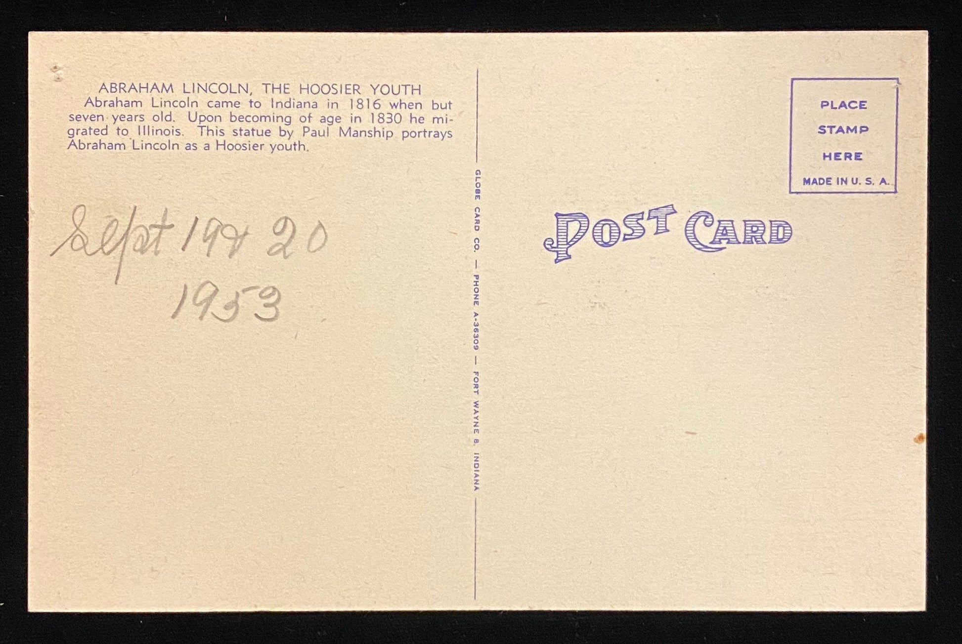 Back: "Abraham Lincoln, the Hoosier Youth. Abraham Lincoln came to Indiana in 1816 when but seven years old. Upon becoming of age in 1830 he migrated to Illinois. This statue by Paul Manship portrays Abraham Lincoln as a Hoosier youth."
