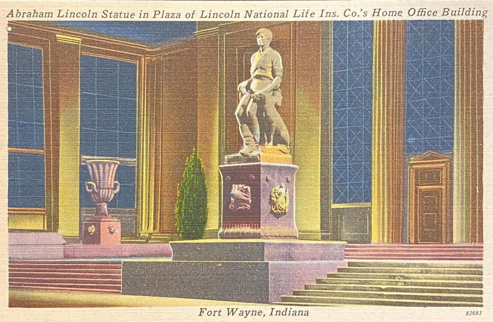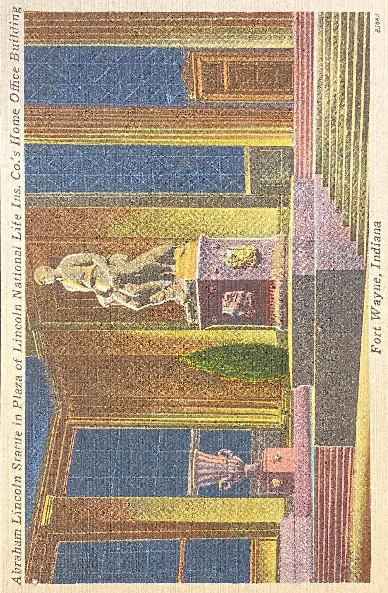 Abraham Lincoln Statue - Plaza of Lincoln National Life Ins. Co.'s Office Building - Fort Wayne, Indiana - 1940s Linen Postcard