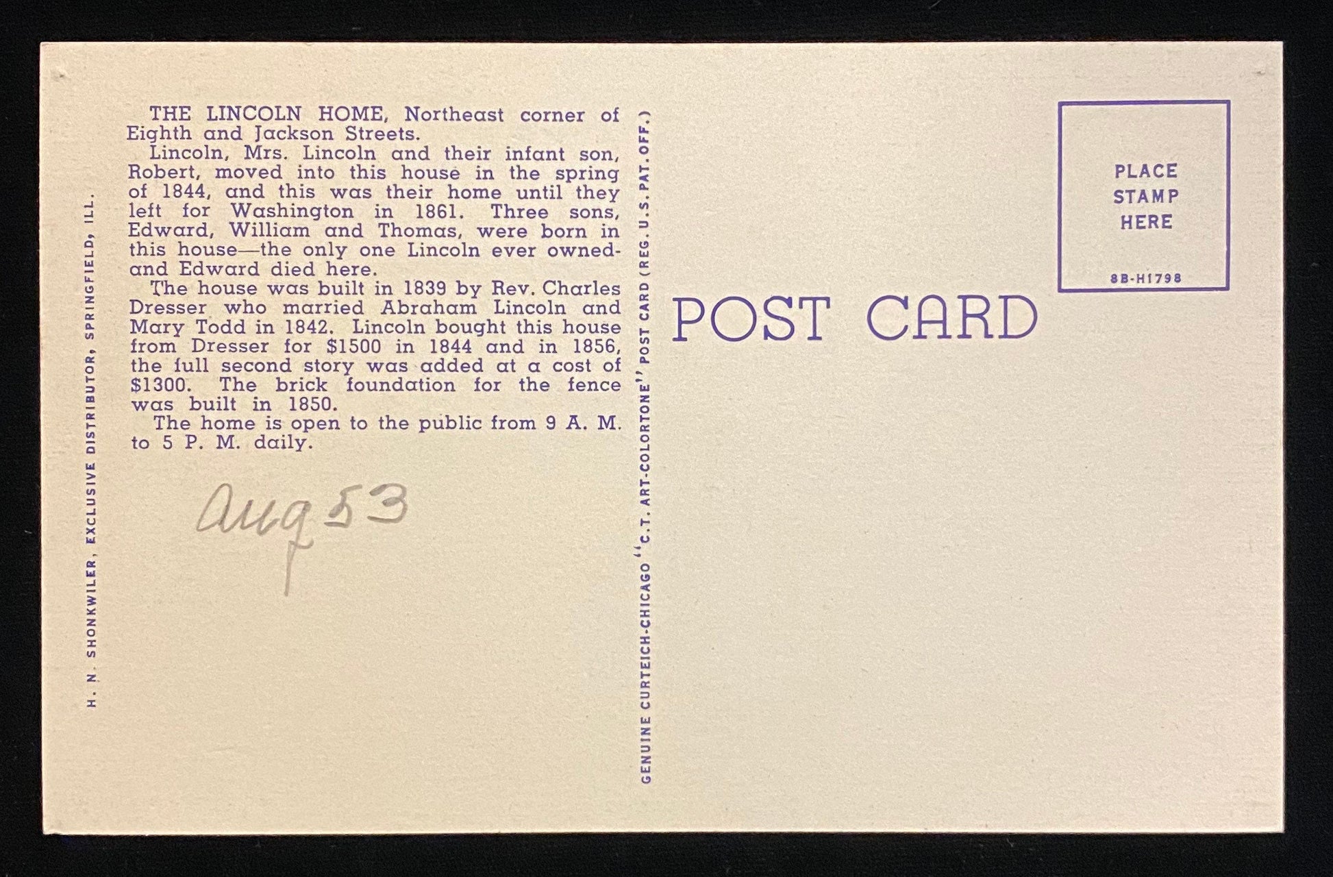 Back: "The Lincoln Home, Northeast corner of Eighth and Jackson Streets. Lincoln, Mrs. Lincoln and their infant son, Robert, moved into this house in the spring of 1844, and this was their home until they left for Washington in 1861. Three sons, Edward, William, and Thomas, were born in this house - the only one Lincoln ever owned - and Edward died here. The house was built in 1839 by Rev. Charles Dresser who married Abraham Lincoln and Mary Todd in 1842. Lincoln bought this house from Dresser for $1500 in 1844 and in 1856, the full second story was added at a cost of $1300. The brick foundation for the fence was built in 1850. The home is open to the public from 9 A.M. to 5 P.M. daily."