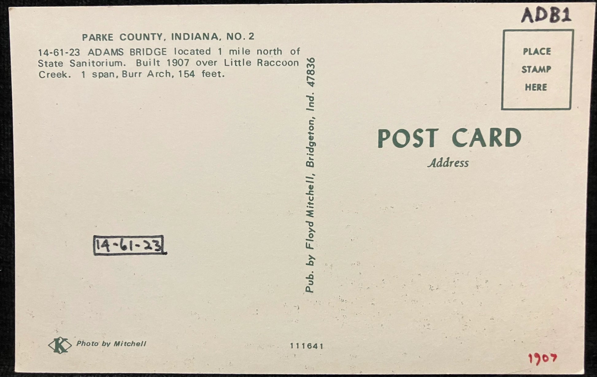 Back: PARKE COUNTY, INDIANA, NO. 2 14-61-23 ADAMS BRIDGE located 1 miles north of State Sanitorium. Built 1907 over Little Raccoon Creek. 1 span, Burr Arch, 154 feet.