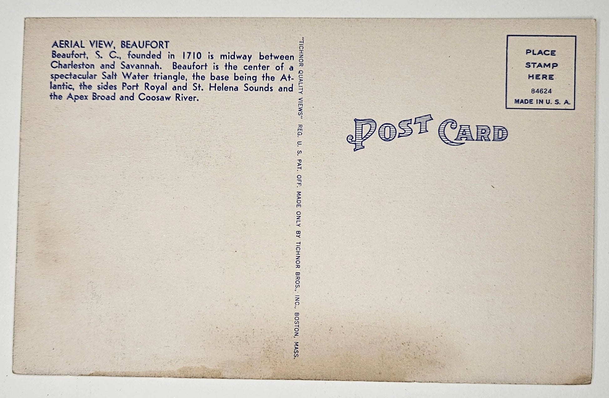 Back: AERIAL VIEW, BEAUFORT Beaufort, S. C., founded in 1710 is midway between Charleston and Savannah. Beaufort is the center of a spectacular Salt Water triangle, the base being the Atlantic, the sides Port Royal and St. Helena Sounds and the Apex Broad and Coosaw River.