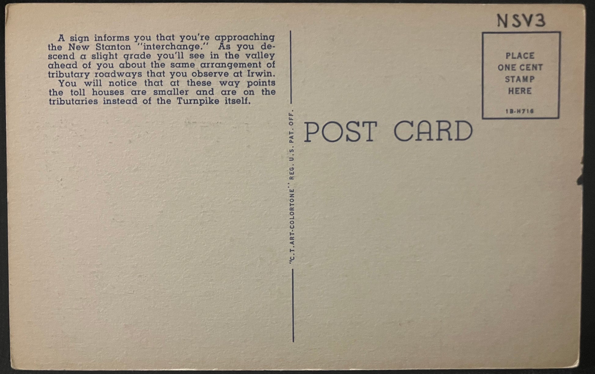 Back: A sign informs you that you're approaching the New Stanton "interchange." as you descend a slight grade you will see in  the valley ahead of you about the same arrangement of the tributary roadways that you observe at Irwin. You will notice that at these way points the toll houses are smaller and are on the tributaries instead of the Turnpike itself.