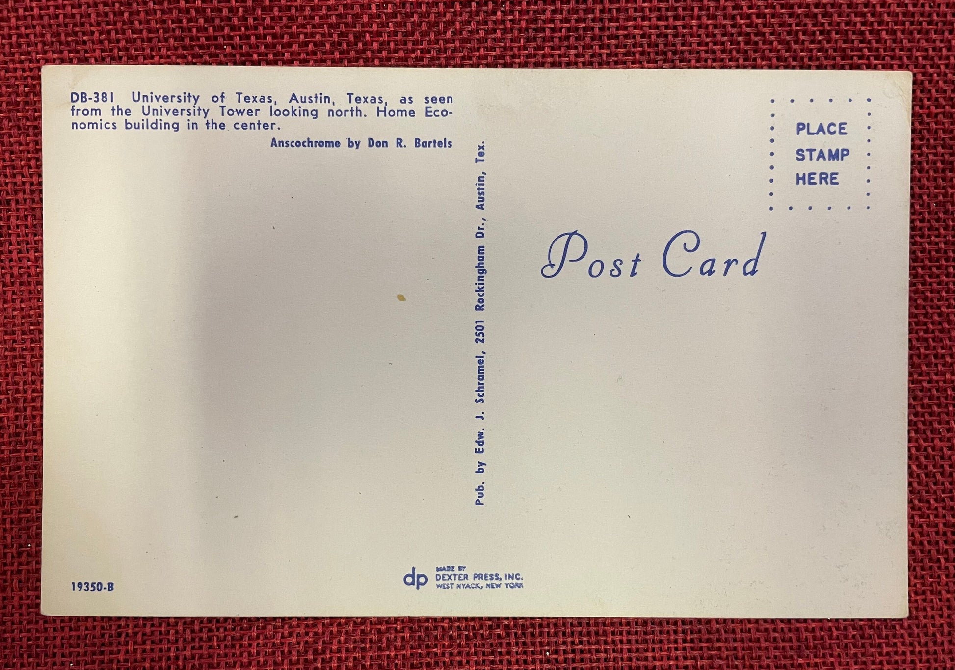 "University of Texas, Austin, Texas, as seen from the University Tower looking north. Home Economics building in the center. Ansochome by Don R. Bartels."