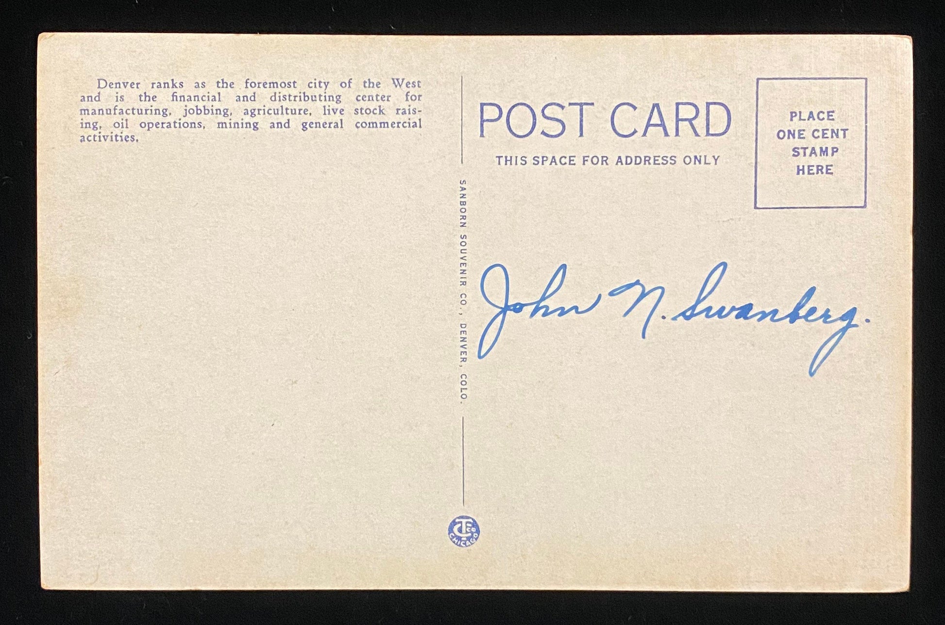 Back: "Denver ranks as the foremost city of the west and is the financial, and distributing center for manufacturing, jobbing, agriculture, live stock raising, oil operations, mining and general commercial activities."