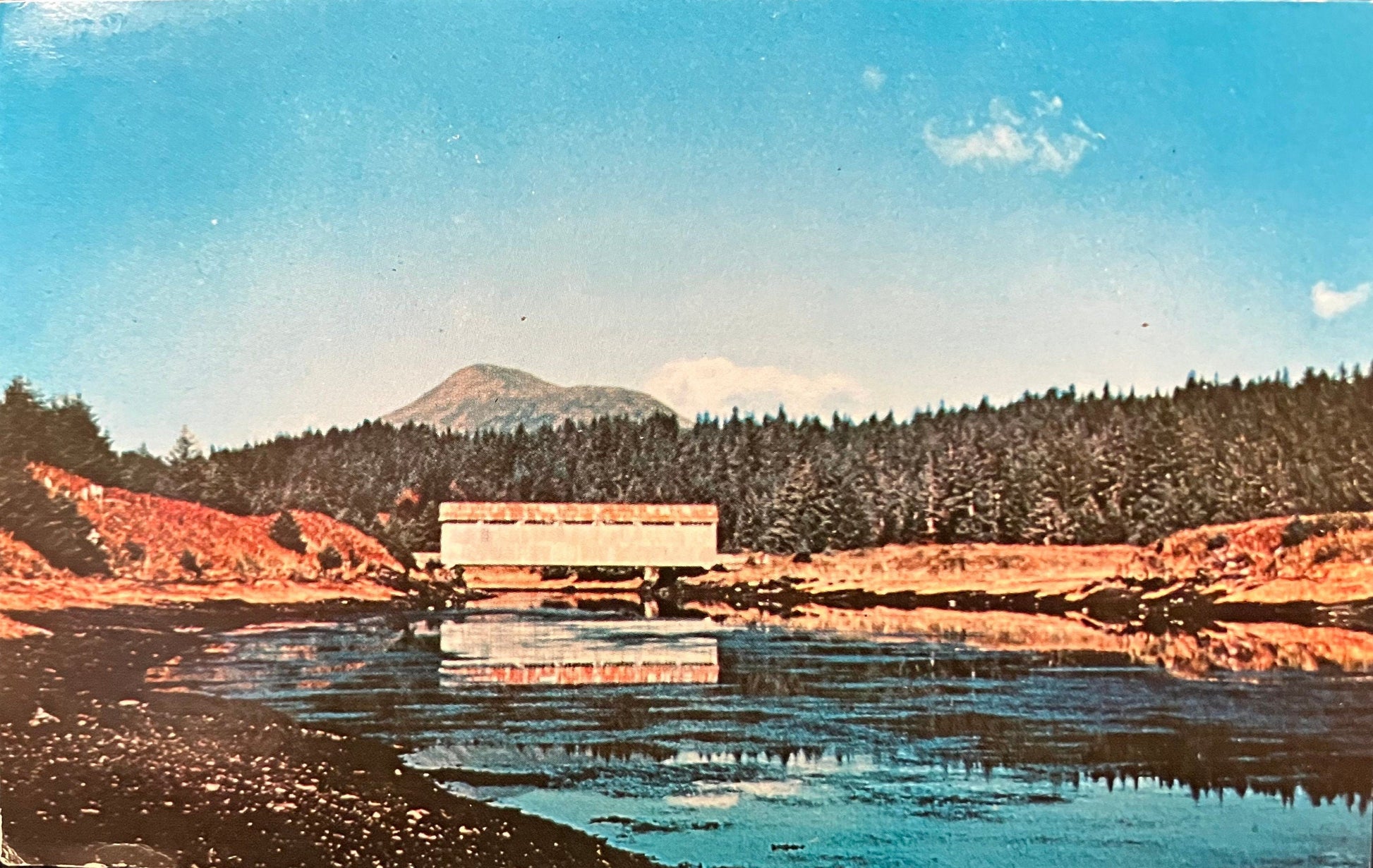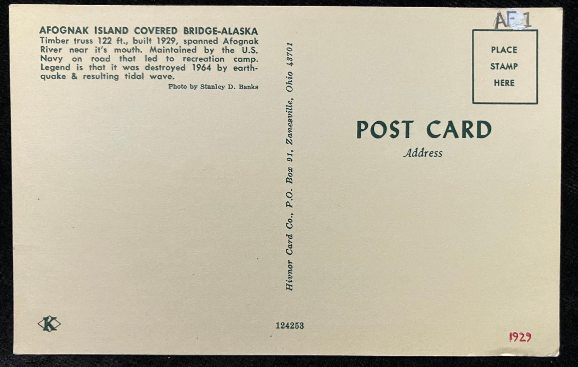 On back: Afognak Island Covered Bridge, Alaska. Timber truss 122 ft., built 1929, spanned Afognak River near it’s mouth. Maintained by the U.S. Navy on road that led to recreation camp. Legend is that it was destroyed in 1964 by earthquake & resulting tidal wave. Photo by Stanley D. Banks.
