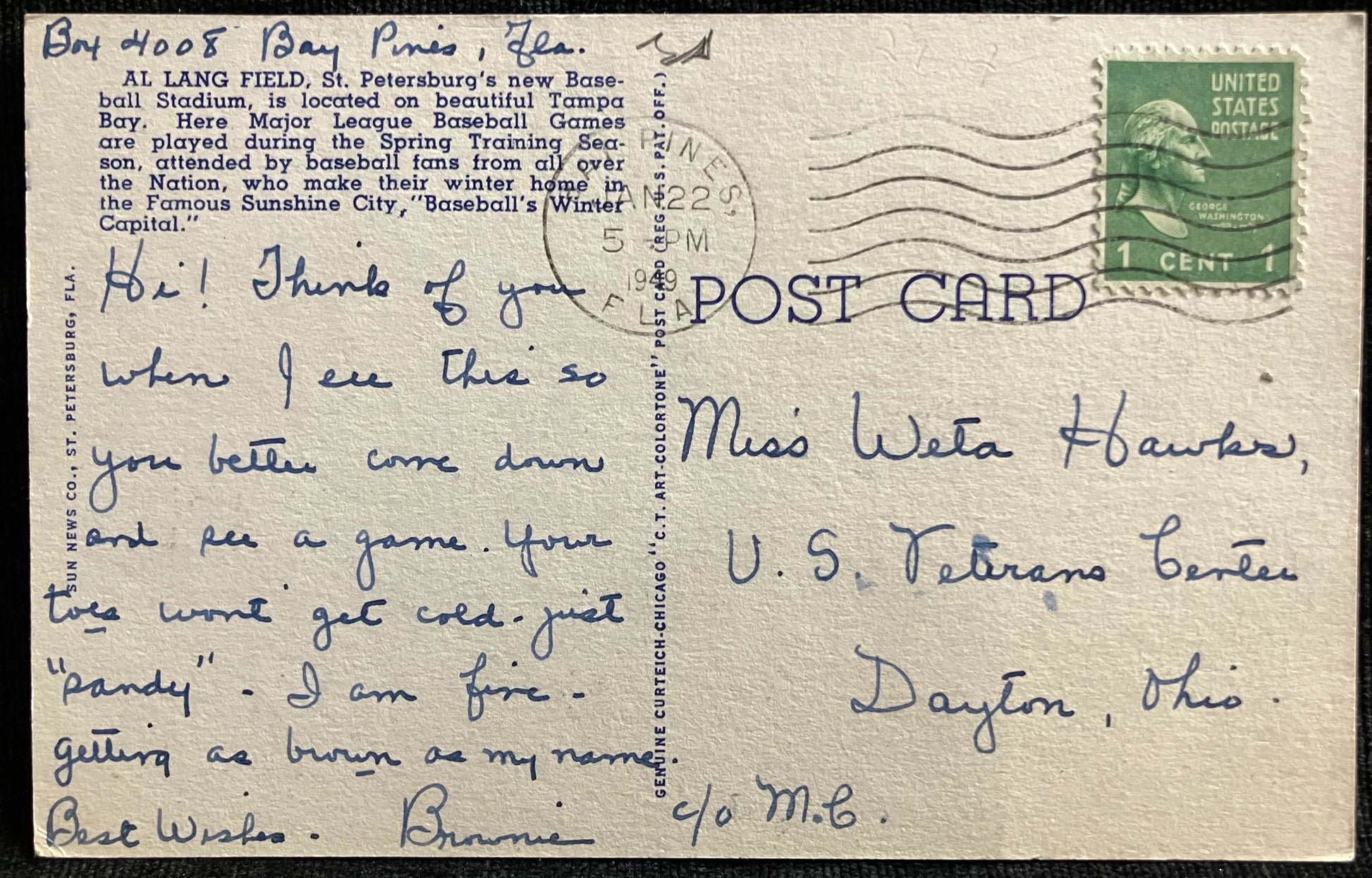 Back: Al Lang Field, St. Petersburg’s new Baseball Stadium, is located on beautiful Tampa Bay. Here, Major League Baseball games are played during the Spring Training Season, attended by baseball fans from all over the Nation, who make their winter home in the famous Sunshine City, “Baseball's Winter Capital.”