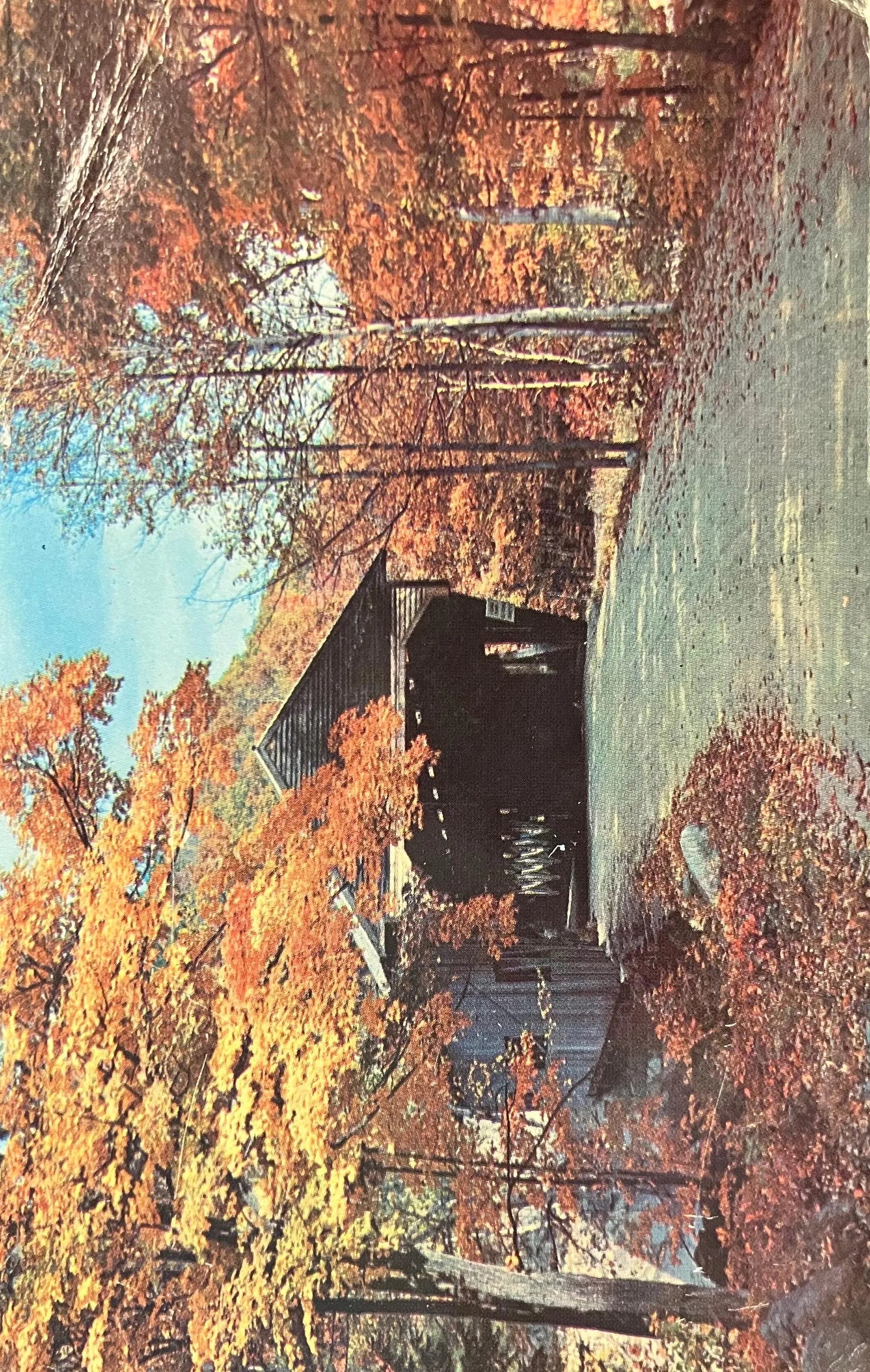 On back: The old covered bridges are fast giving way to modern construction. The covered bridge served as shelter for man and beast.