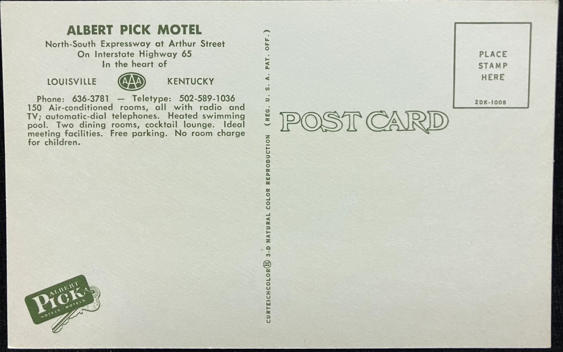On back: ALBERT PICK MOTEL | North-South Expressway at Arthur Street On Interstate Highway 65 In the Heart of Louisville, Kentucky | Phone: 636-3781 - Teletype: 502-589-1036 | 150 Air-conditioned rooms, all with radio and TV; automatic dial telephones. Heated swimming pool. Two dining rooms, a cocktail lounge. Ideal meeting facilities. Free parking. No room charge for children.