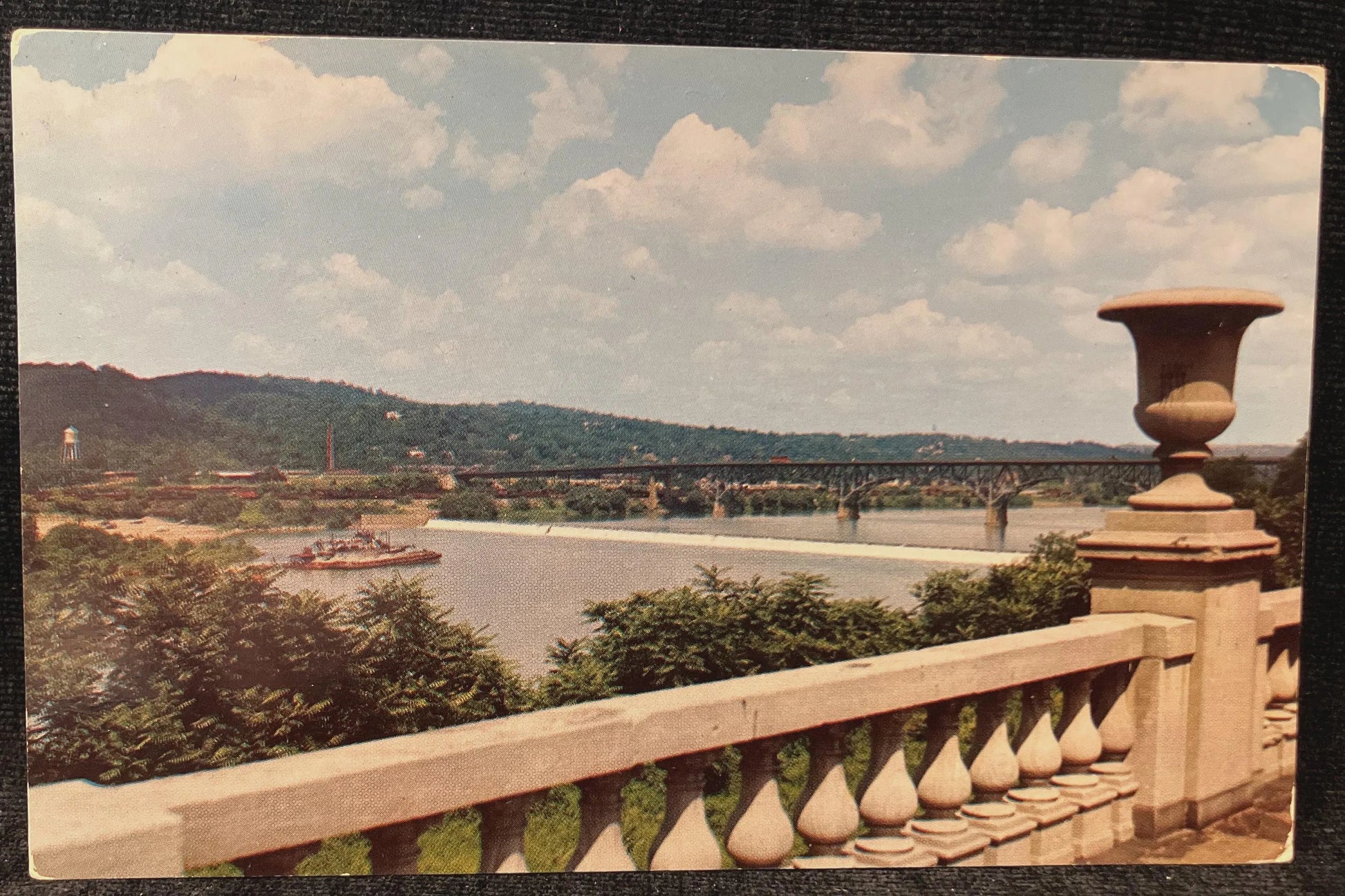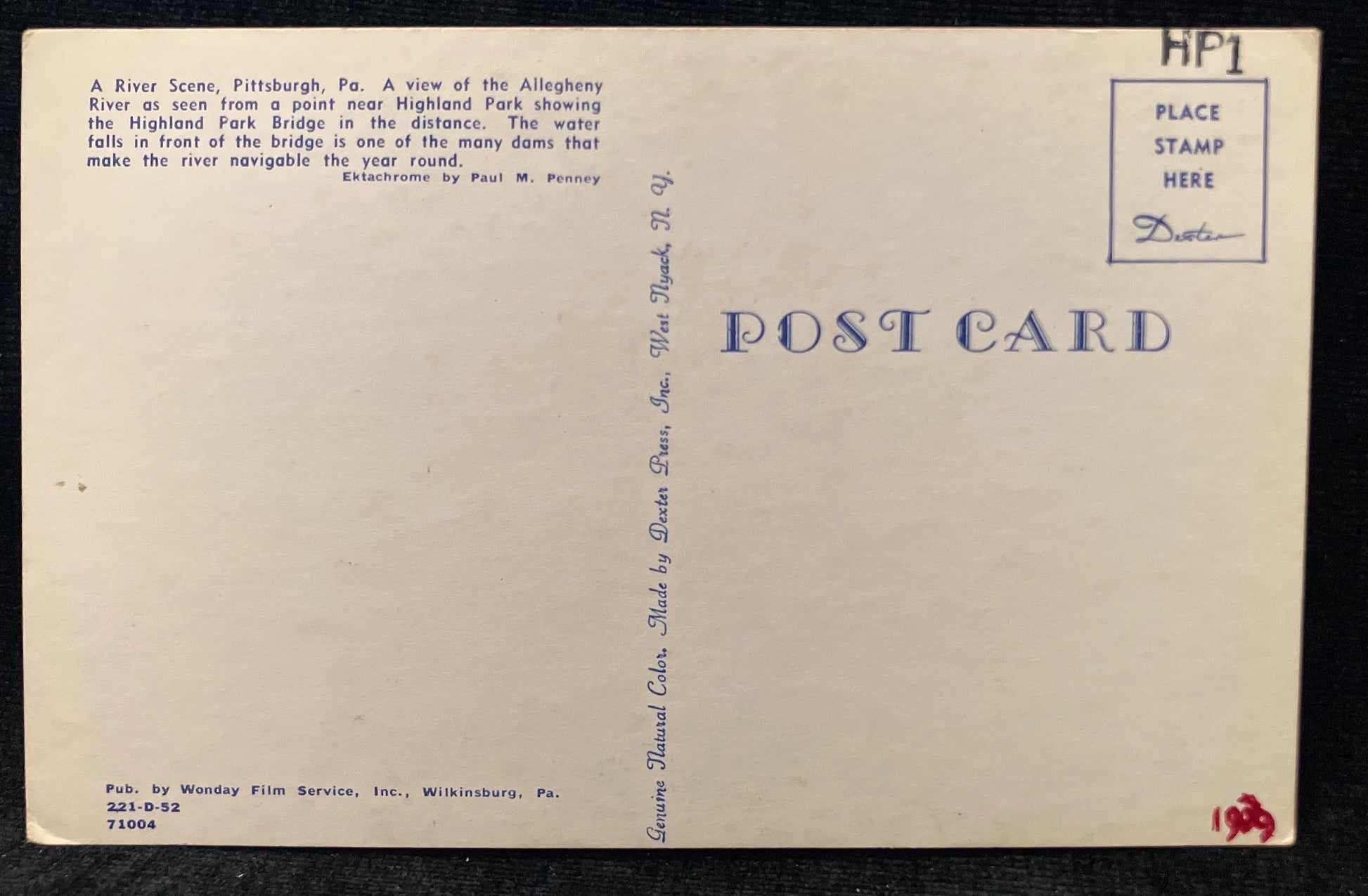 Back: A River Scene, Pittsburgh, Pa. A view of the Allegheny River as seen from a point near Highland Park showing the Highland Park Bridge in the distance. The water falls in front of the bridge is one of the many dams that make the river navigable the year round.