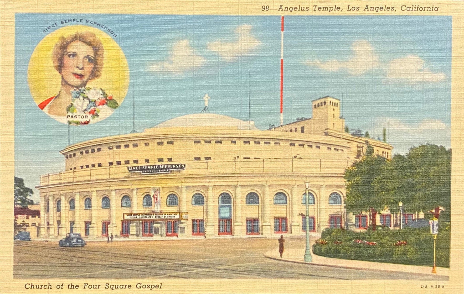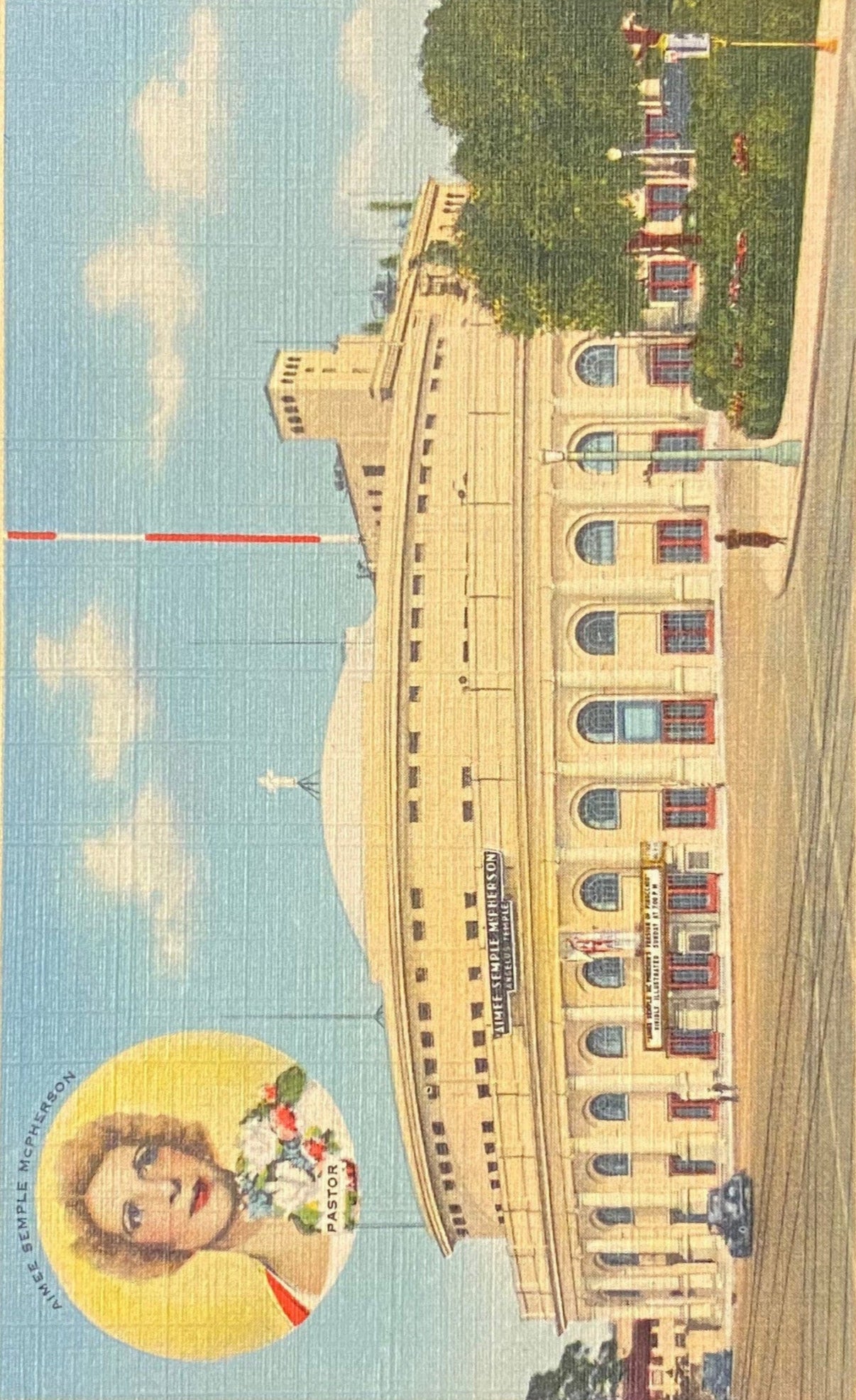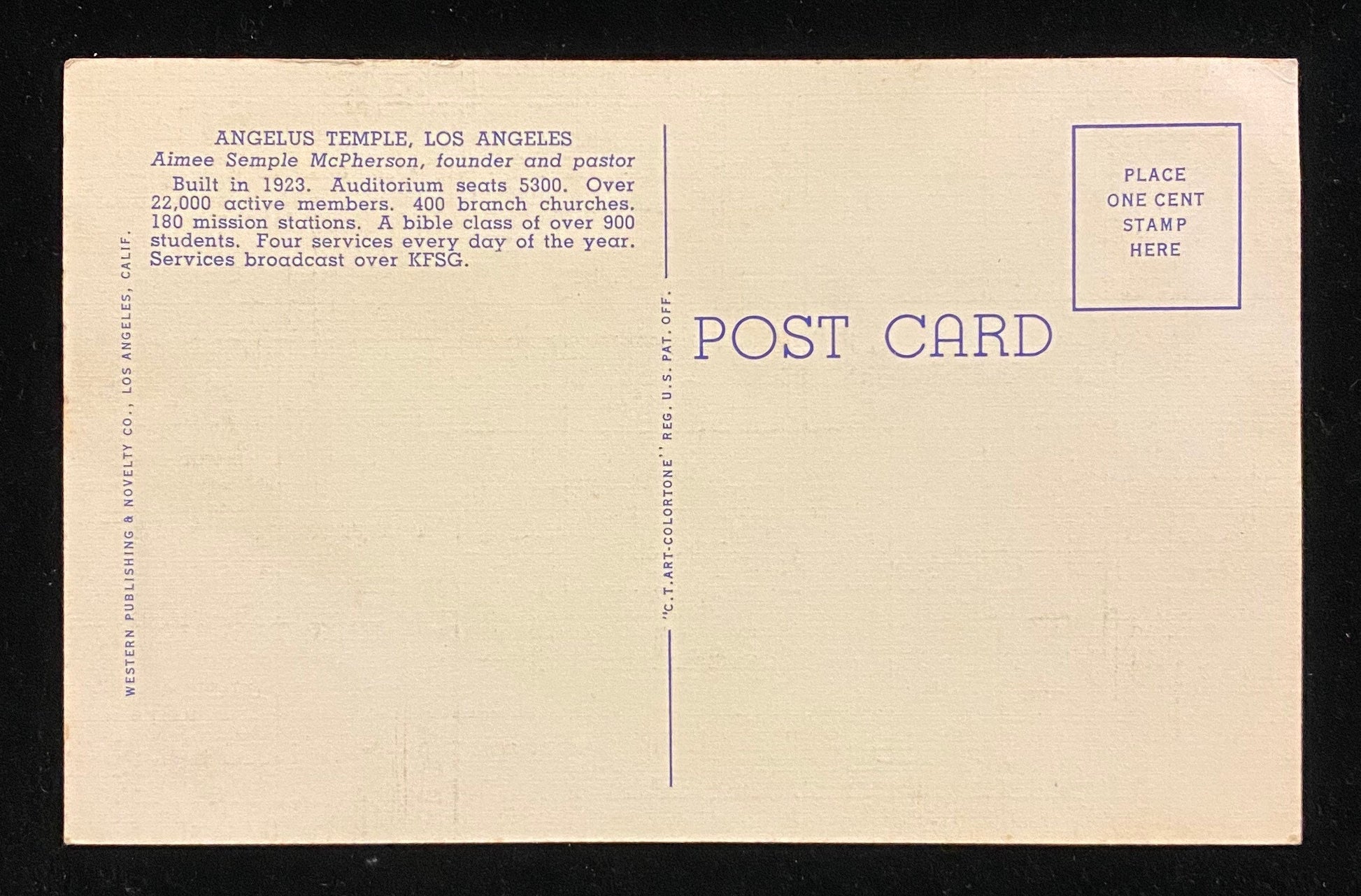 Back Information: "Angelus Temple, Los Angeles, Aimee Semple McPherson, founder and pastor. Built in 1923. Auditorium seats 5300. Over 22,000 active members. 400 branch churches. 180 mission stations. A bible class of over 900 students. Four services every day of the year. Services broadcast over KFSG."