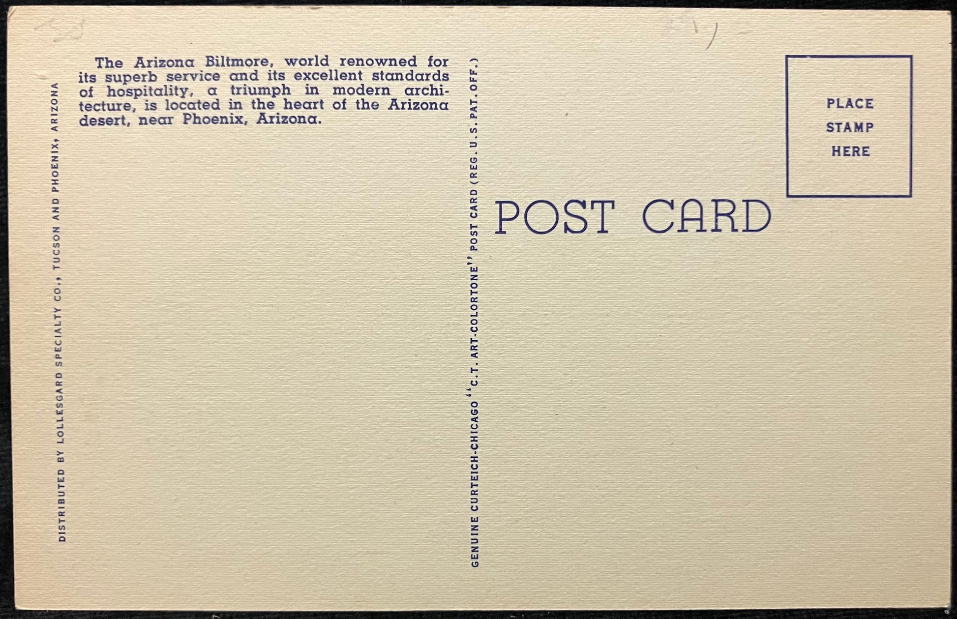 On back: The Arizona Biltmore, world renowned for its superb service and its excellent standards of hospitality, a triumph in modern architecture, is located in the heart of the Arizona desert, near Phoenix, Arizona.