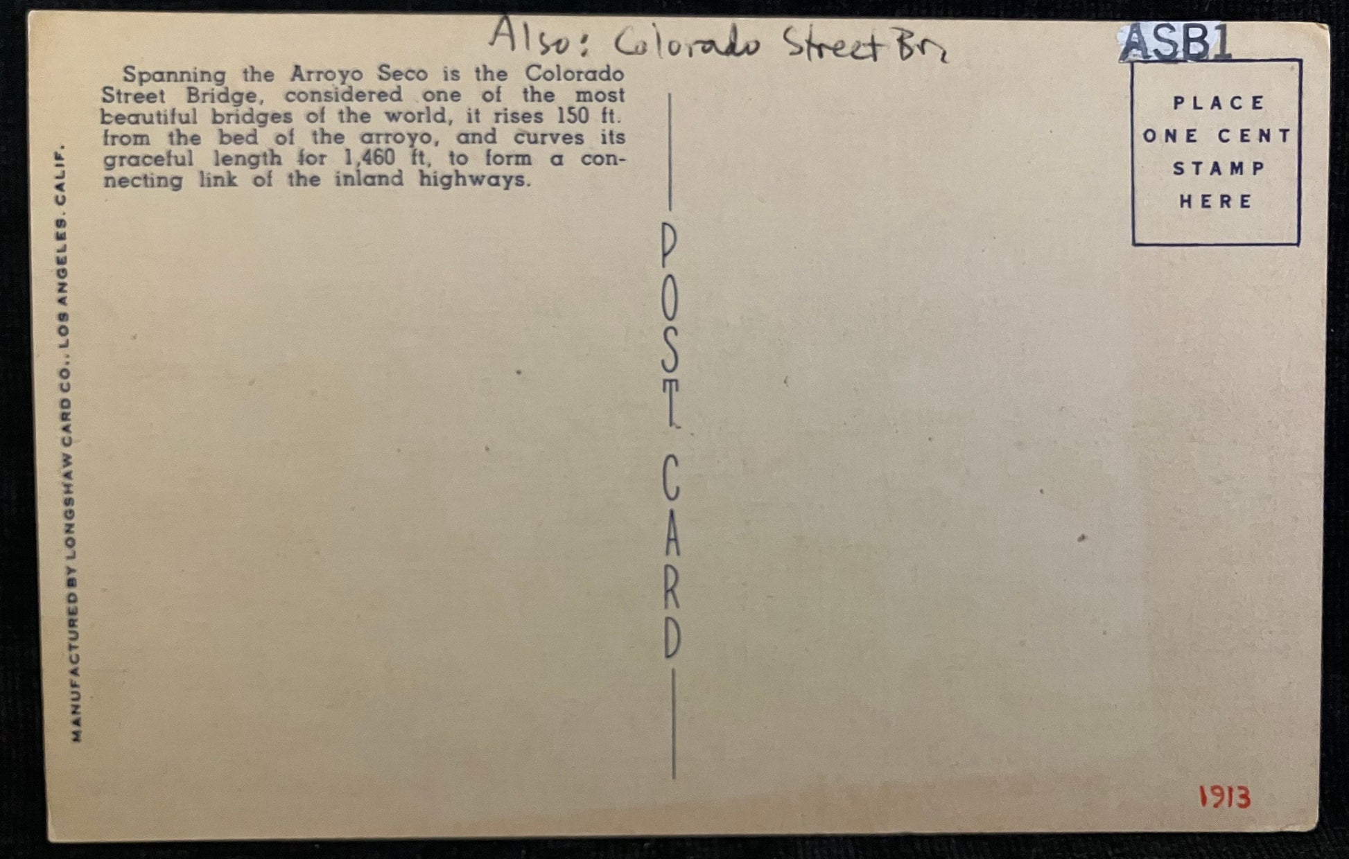 Back: Spanning the Arroyo Seco is the Colorado Street Bridge, considered one of the most beautiful bridges in the world, it rises 150 ft. from the bed of the arroyo, and curves its graceful length of 1,460 ft, to form a connecting link of the inland highways.