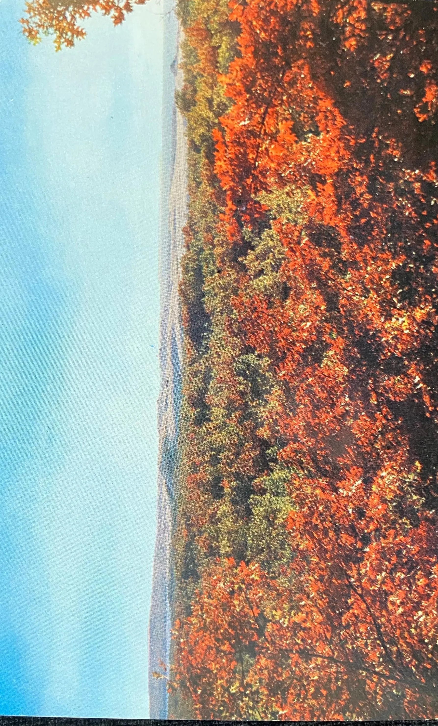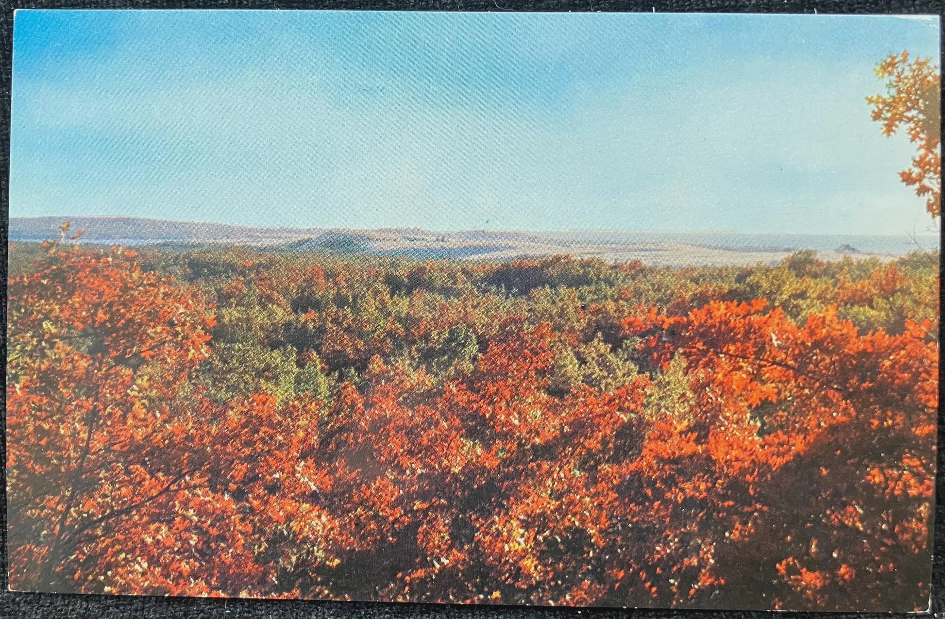 Back: AUTUMN VIEW ACROSS THE SILVER LAKE DUNES This colorful scene was made from a high vantage point along the Old Trails scenic route overlooking the dunes and distant Silver Lake and Lake Michigan.