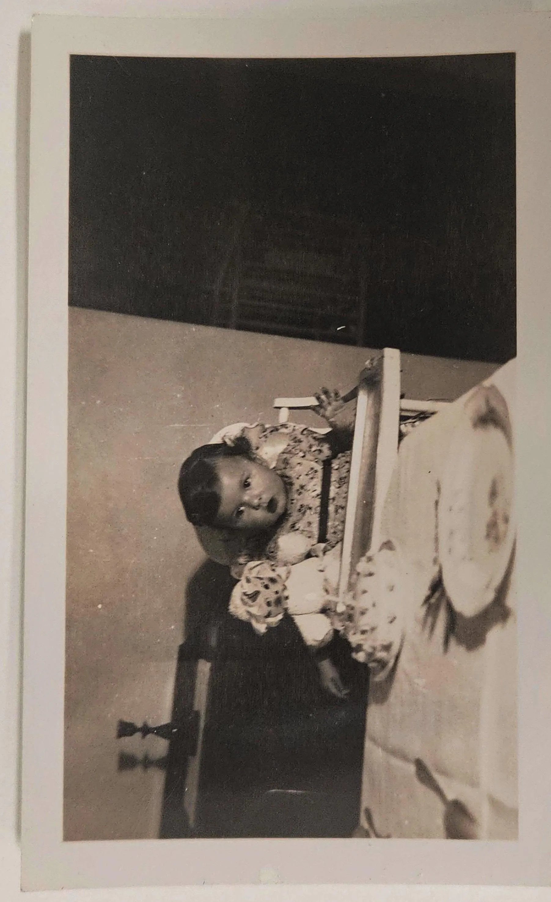 Baby's First Birthday Photograph- Late 1930s Photograph- Baby Girl in Highchair with Doll and Cake with one candle - Black and White Photo, this is an in home photo that could have been better with more light, but the child has a beautiful face.