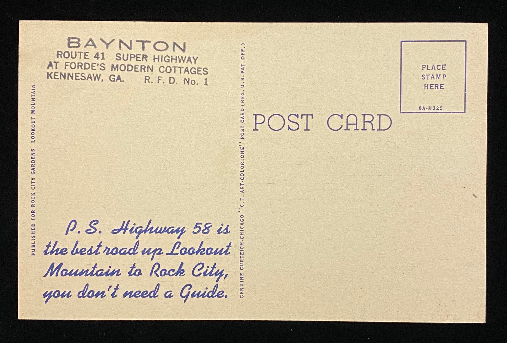 Back Information: "Baynton Route 41 Super Highway at Forde's Modern Cottages Kennesaw, GA. R.F.D. No. 1. P.S. Highway 58 is the best road up Lookout Mountain to Rock City, you don't need a guide."