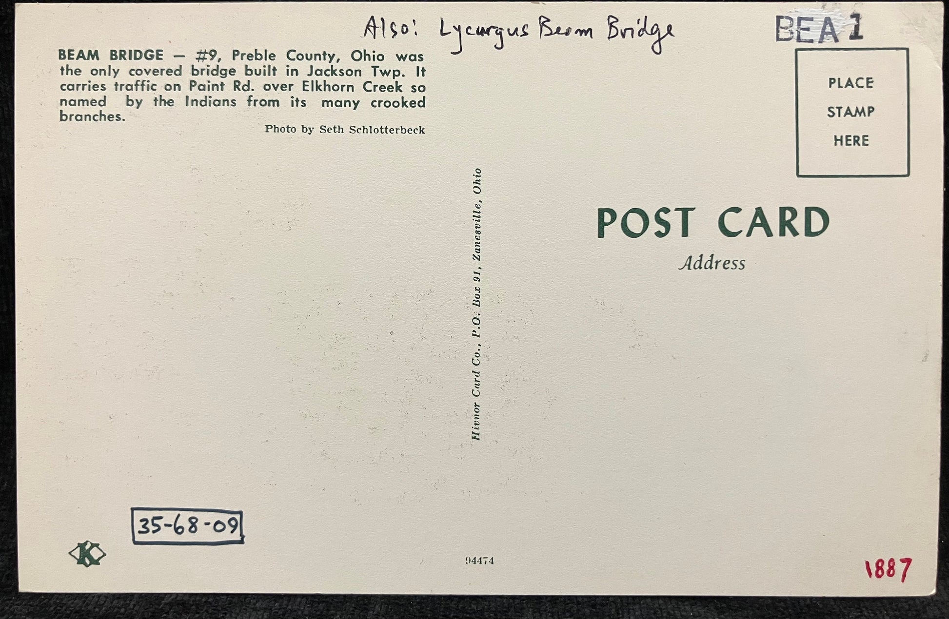 Beam Bridge - Treble County, Ohio - Photo: by Seth Schlotterbeck - Vintage Covered Bridge Postcard