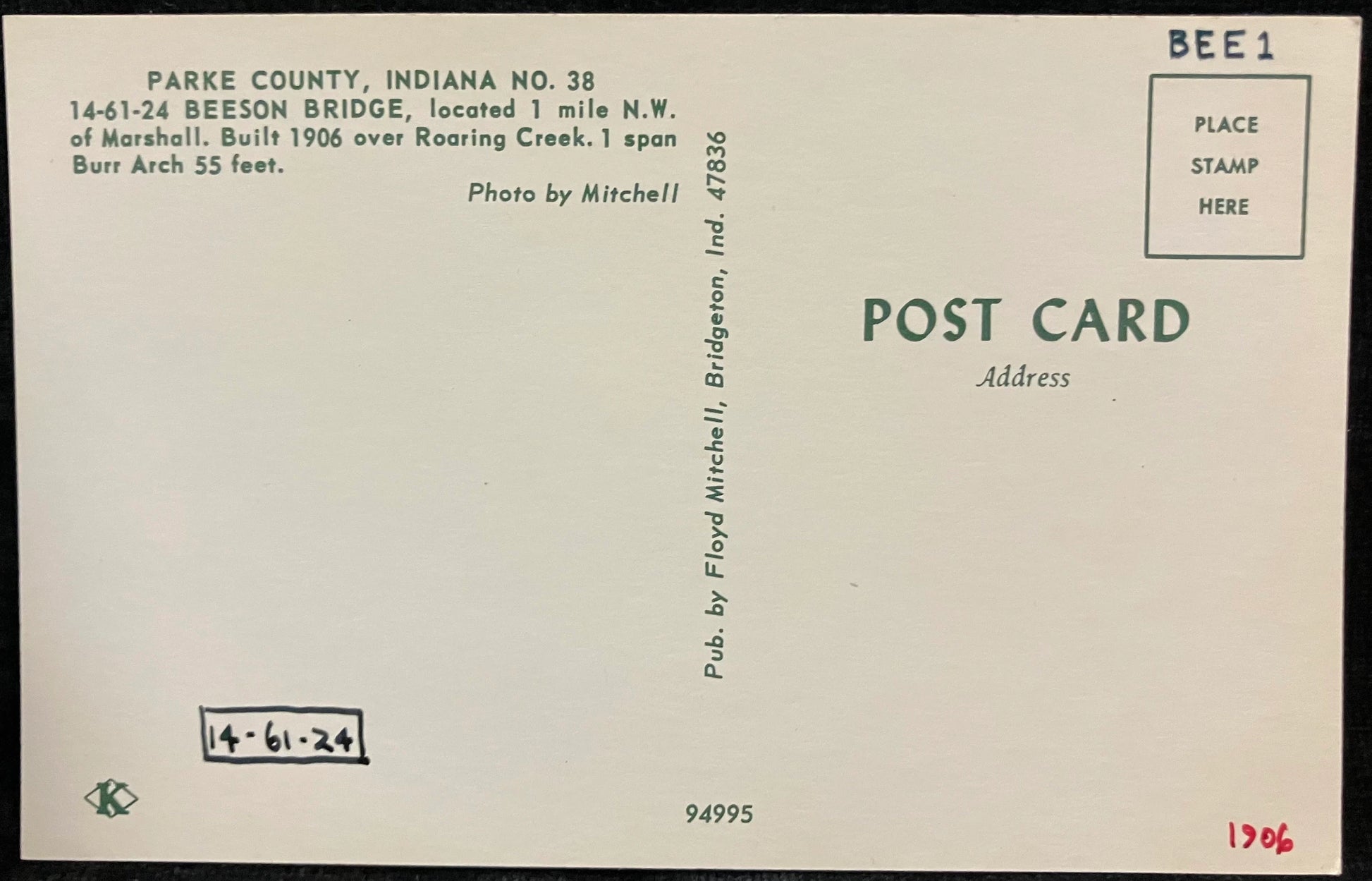 Back: Parke County, Indiana No. 38 14-61-24 Beeson Bridge, located 1 mile N. W. of Marshall. Built 1906 over Roaring Creek. 1 Burr Arch 55 feet.