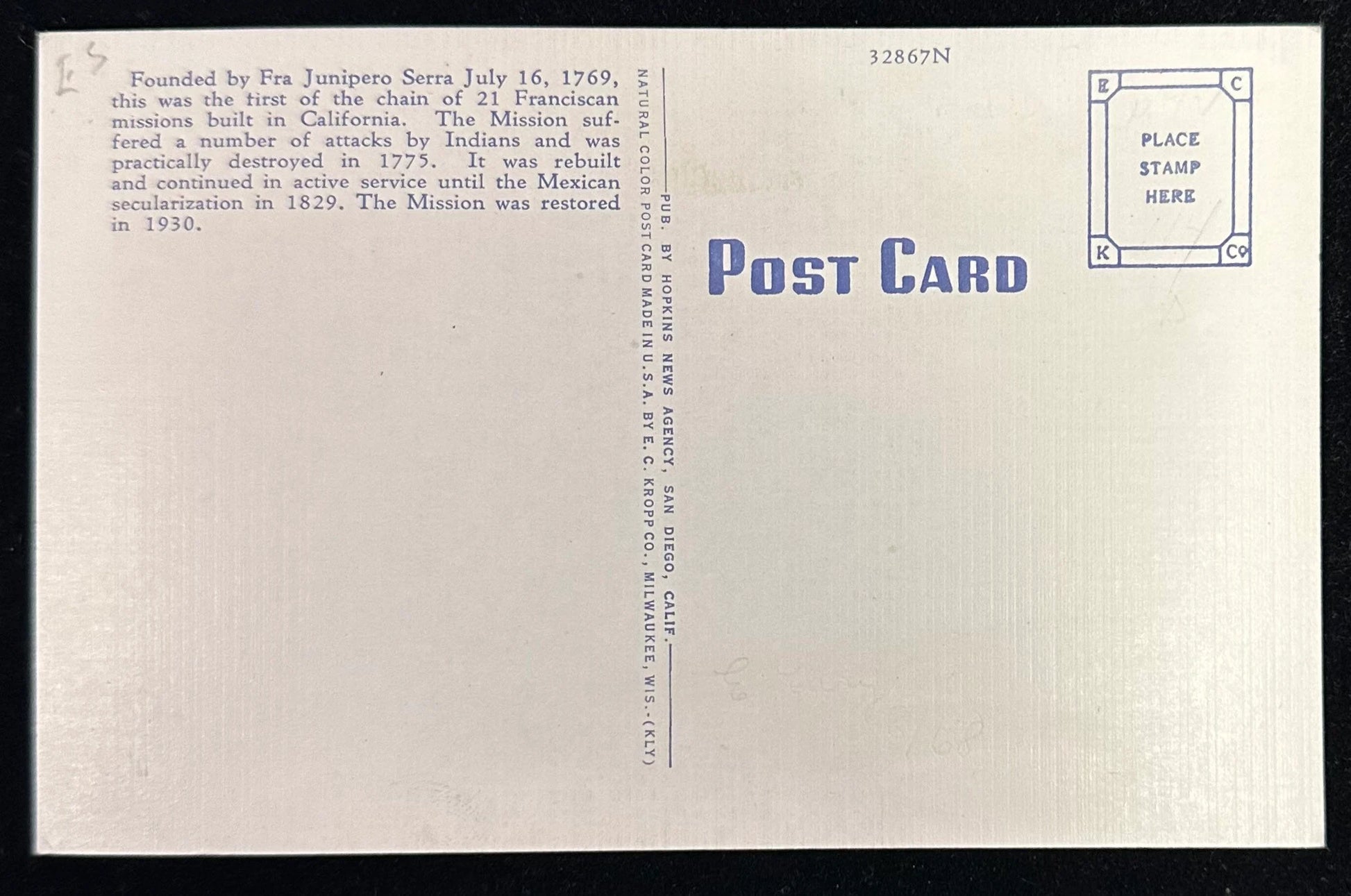 Back Information: Founded by Fia Junipero Serra on July 16, 1779, this was the first of the chain of 21 Franciscan missions built in California. The Mission suffered several attacks by Indians and was practically destroyed in 1773. It was rebuilt and continued in active service until the Mexican secularization in 1829.  The Mission was restored in 1930.