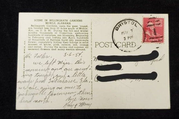 Mailed. Postmark May 7, 1954. Red 2 cent stamp