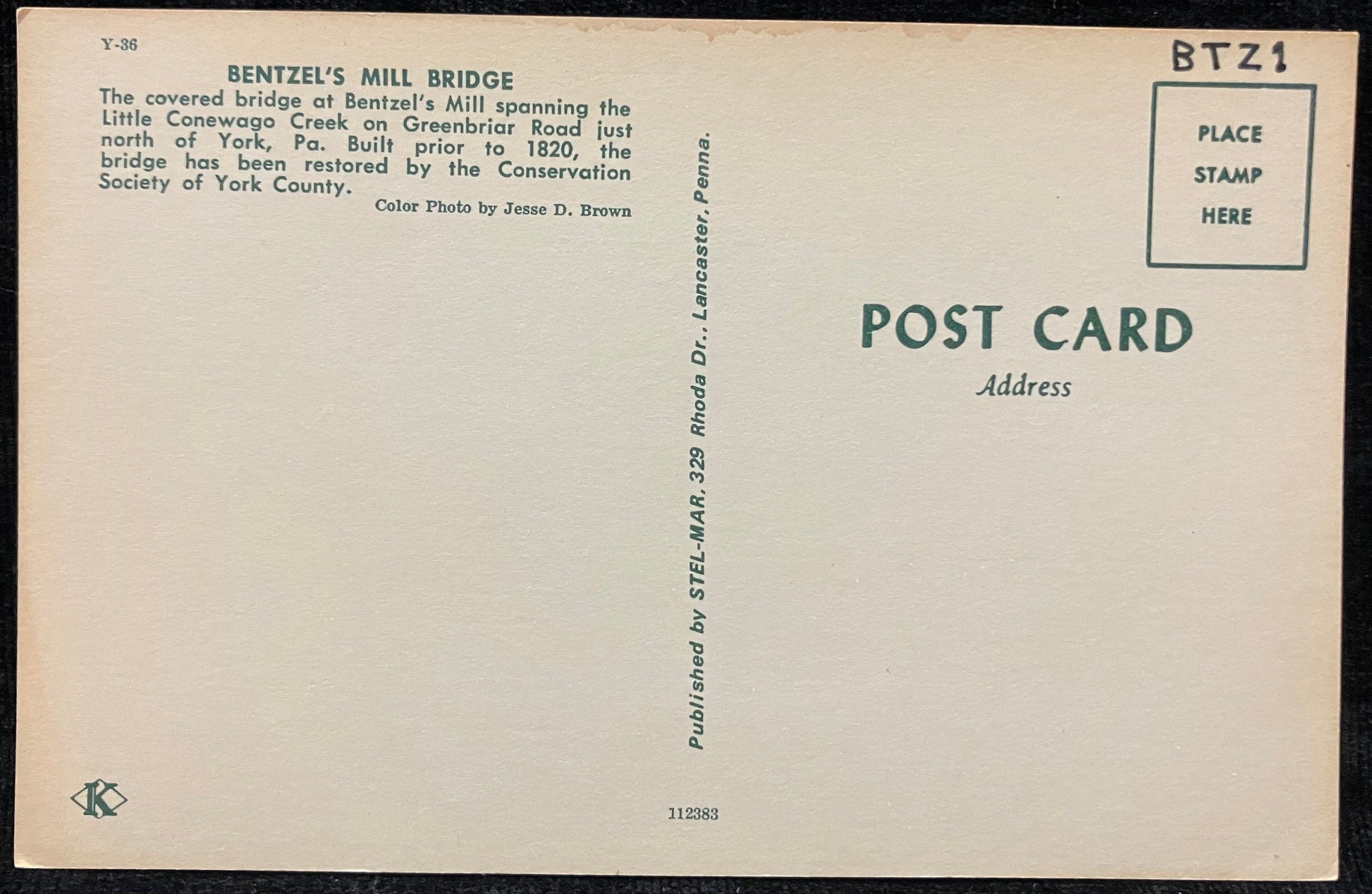 Bentzel's Mill Bridge - Photo: Jesse D. Brown - Vintage Covered Bridge Postcard - Over Little Conewago Creek, York County, Pennsylvania