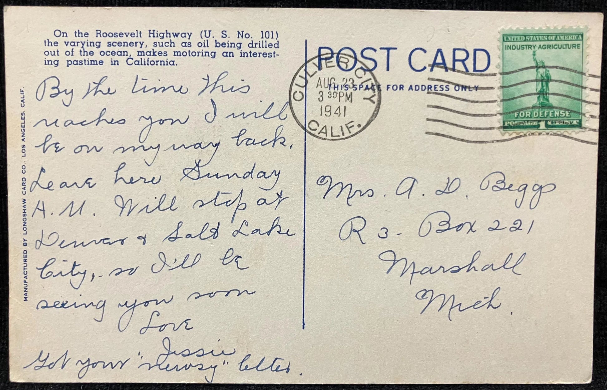 Back: On Roosevelt Highway (U.S. No. 101), the varying scenery, such as oil being drilled out of the ocean, makes motoring an interesting pastime in California. Addressed to Reciever