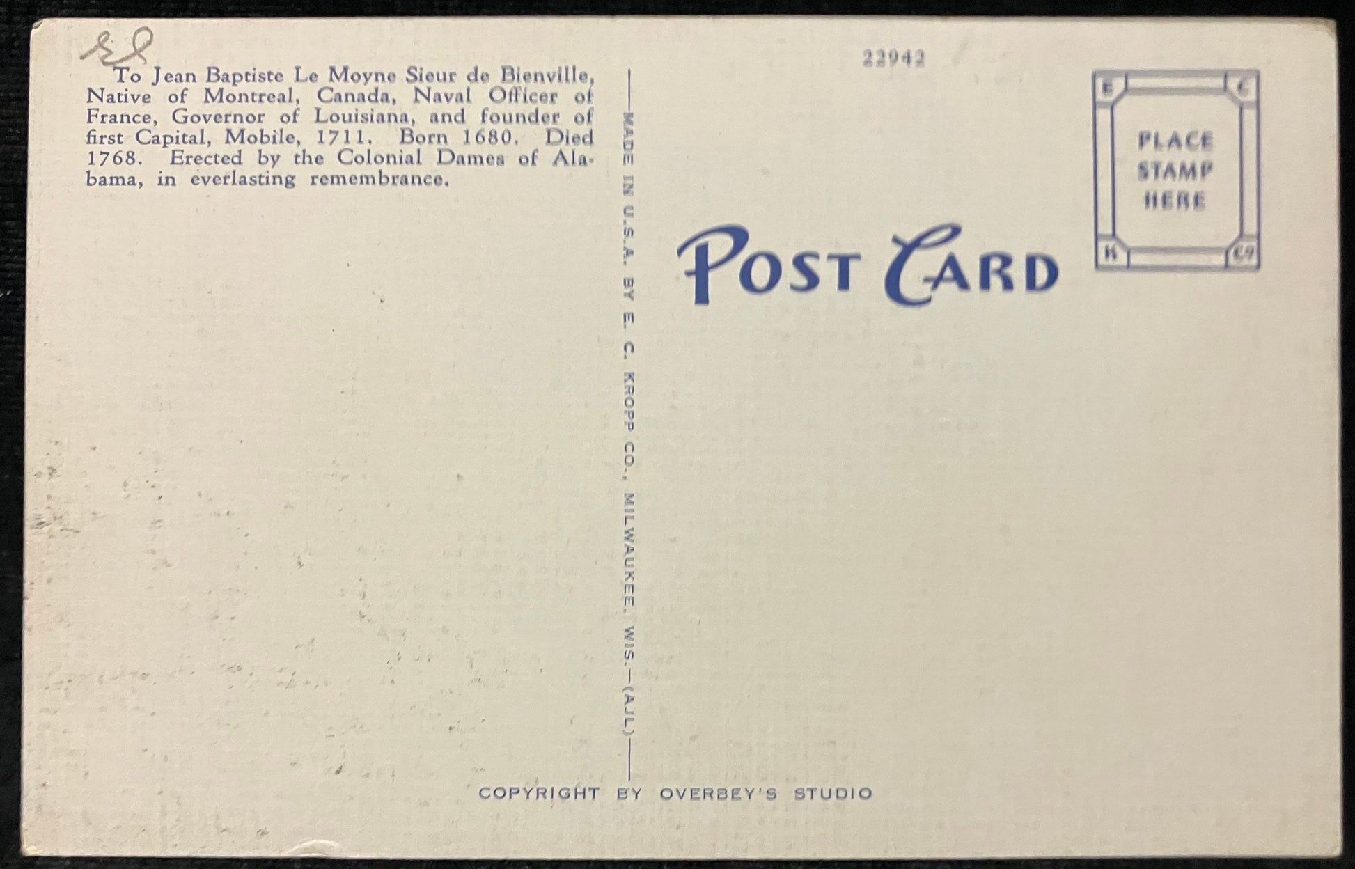 On back: To Jean Baptiste Le Moyne Sieur de Bienville, Native of Montreal, Canada, Naval Officer of first Capital, Mobile, 1711. Born 1680. Died 1786. Erected by the Colonial Dames of Alabama, in everlasting remembrance.