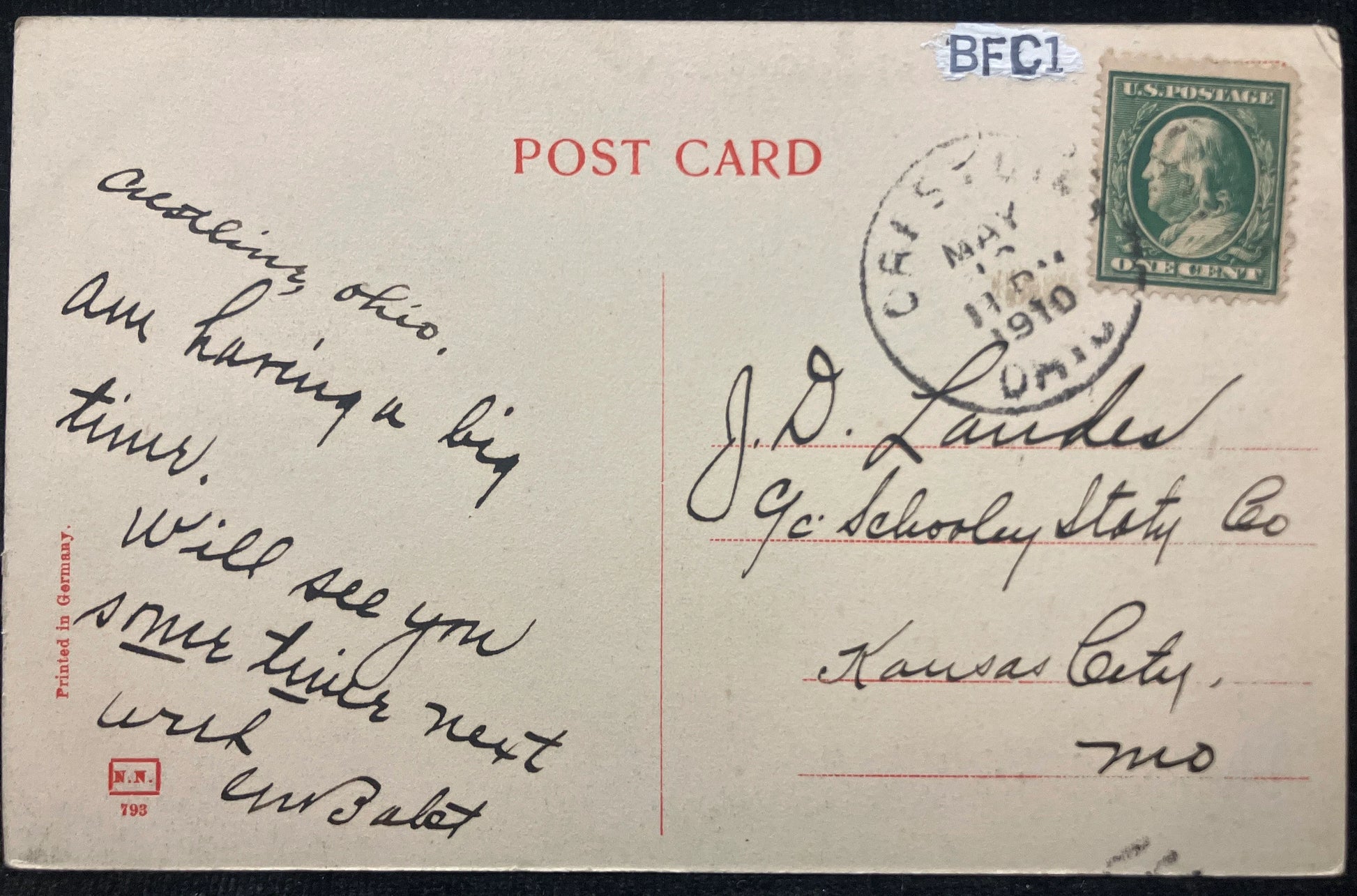 Mailed: Postmark 1910, green one cent Benjamin Franklin stamp