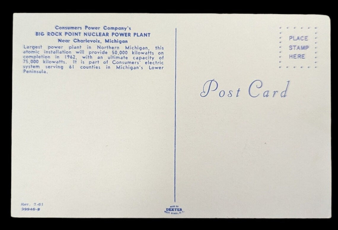 Back: Consumers Power Company's - Big Rock Point Nuclear Power Plant - Near Charlevoix, Michigan. Largest power plant in Northern Michigan, this atomic installation will provide 50,000 kilowatts on completion in 1962, with an ultimate capacity of 75,000 kilowatts. It is part of Consumers' electric system serving 61 counties in Michigan's Lower Peninsula.