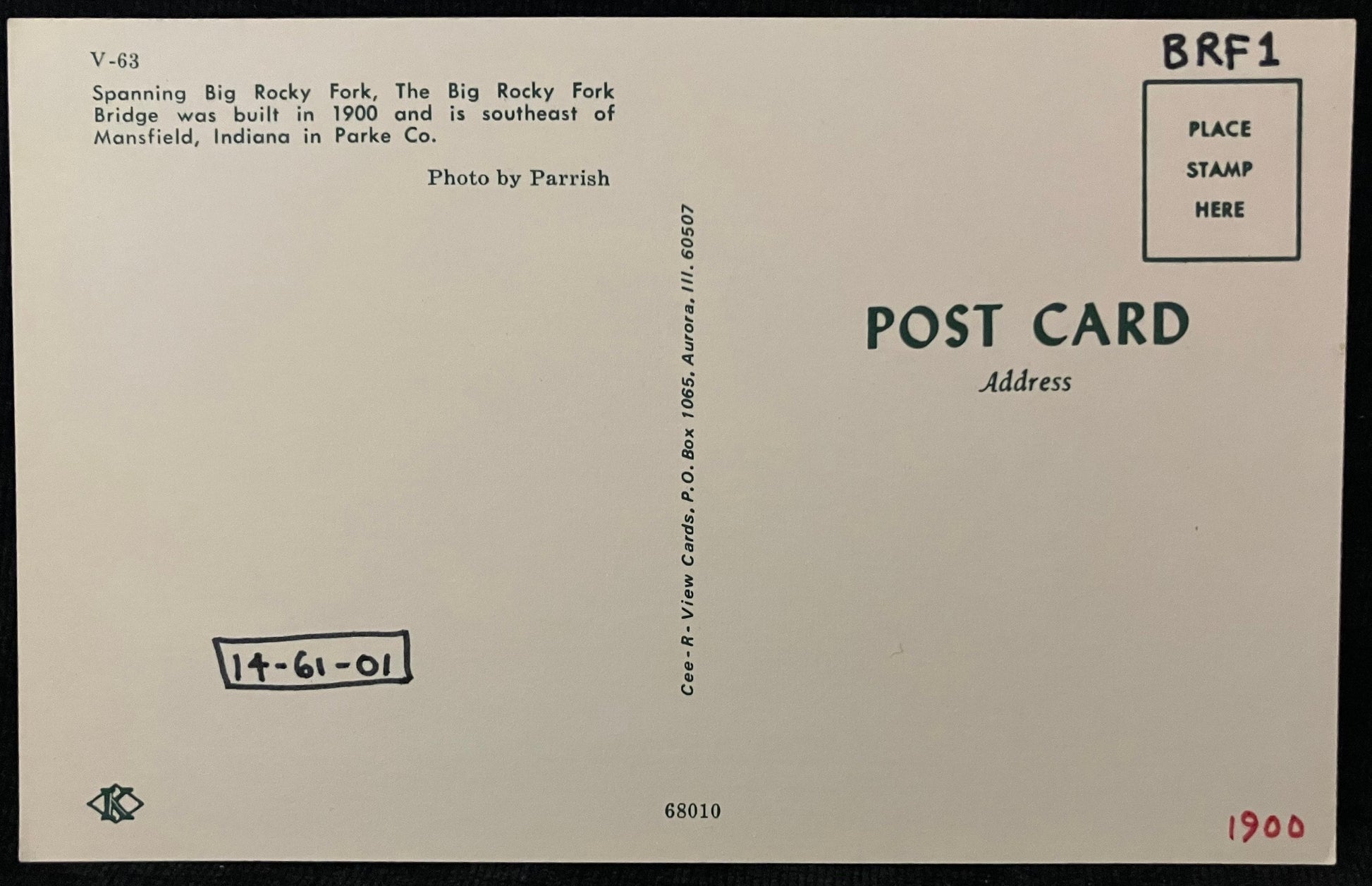 On back: Spanning Big Rock Fork, The Big Rocky Fork Bridge was built in 1900 and is southeast of Mansfield, Indiana in Parke Co.