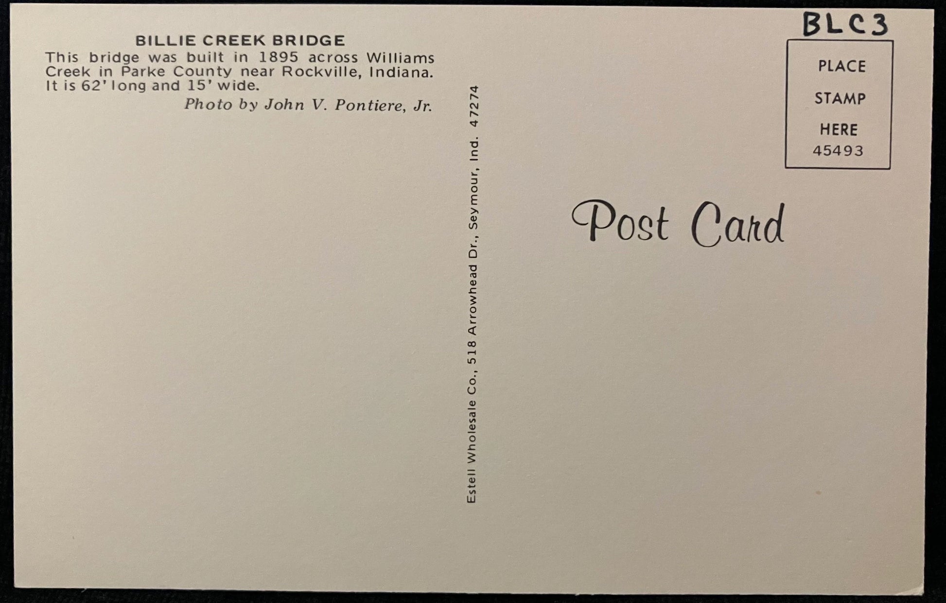 On back: BILLIE CREEK BRIDGE This bridge was built in 1895 across Williams Creek in Parke County near Rockville, Indiana. It is 62' long and 15' wide.