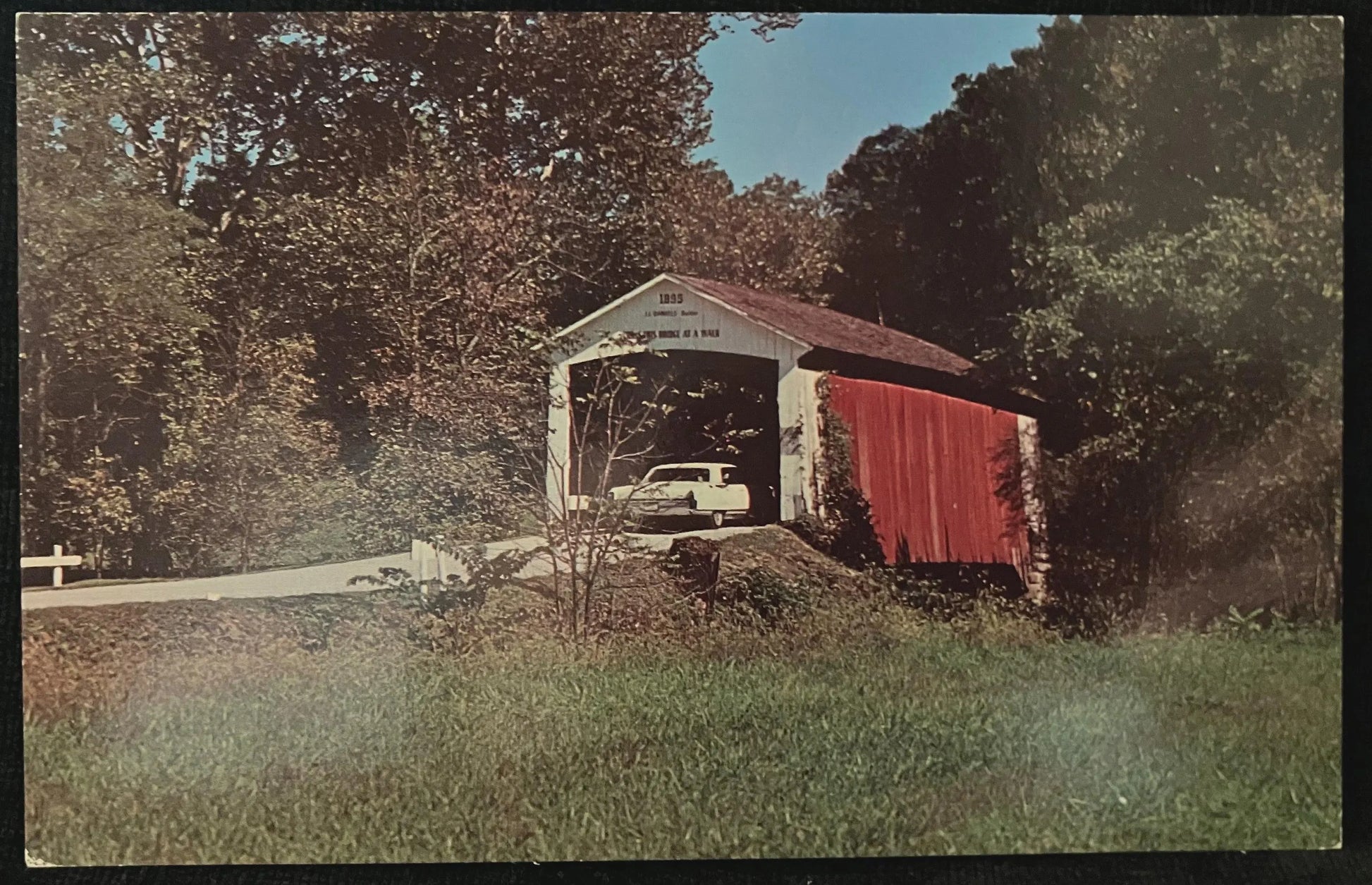 On front: A photo of Billie Creek Bridge, in Parke County, Indiana