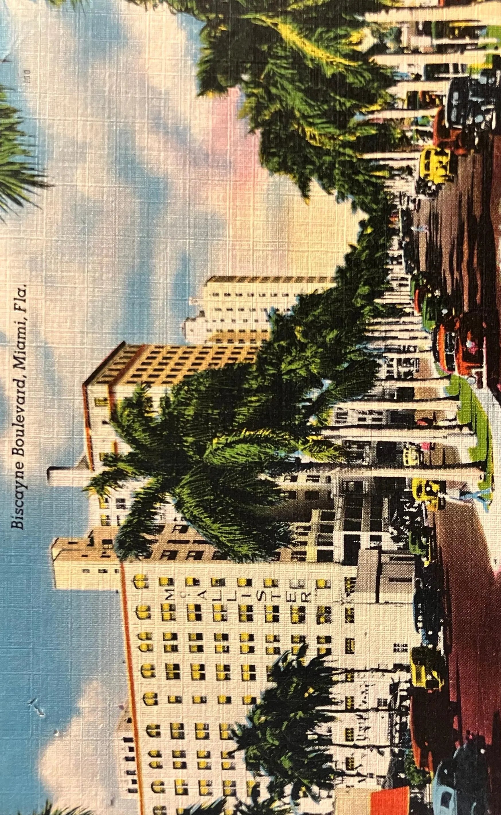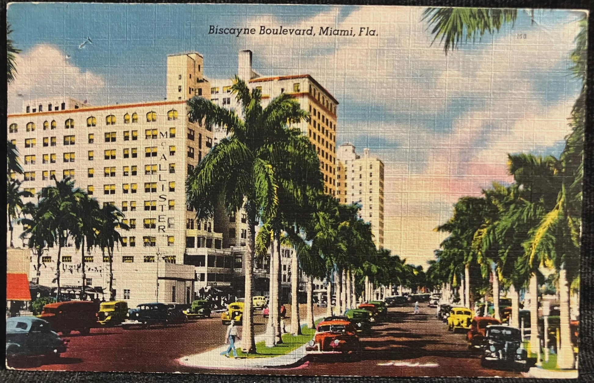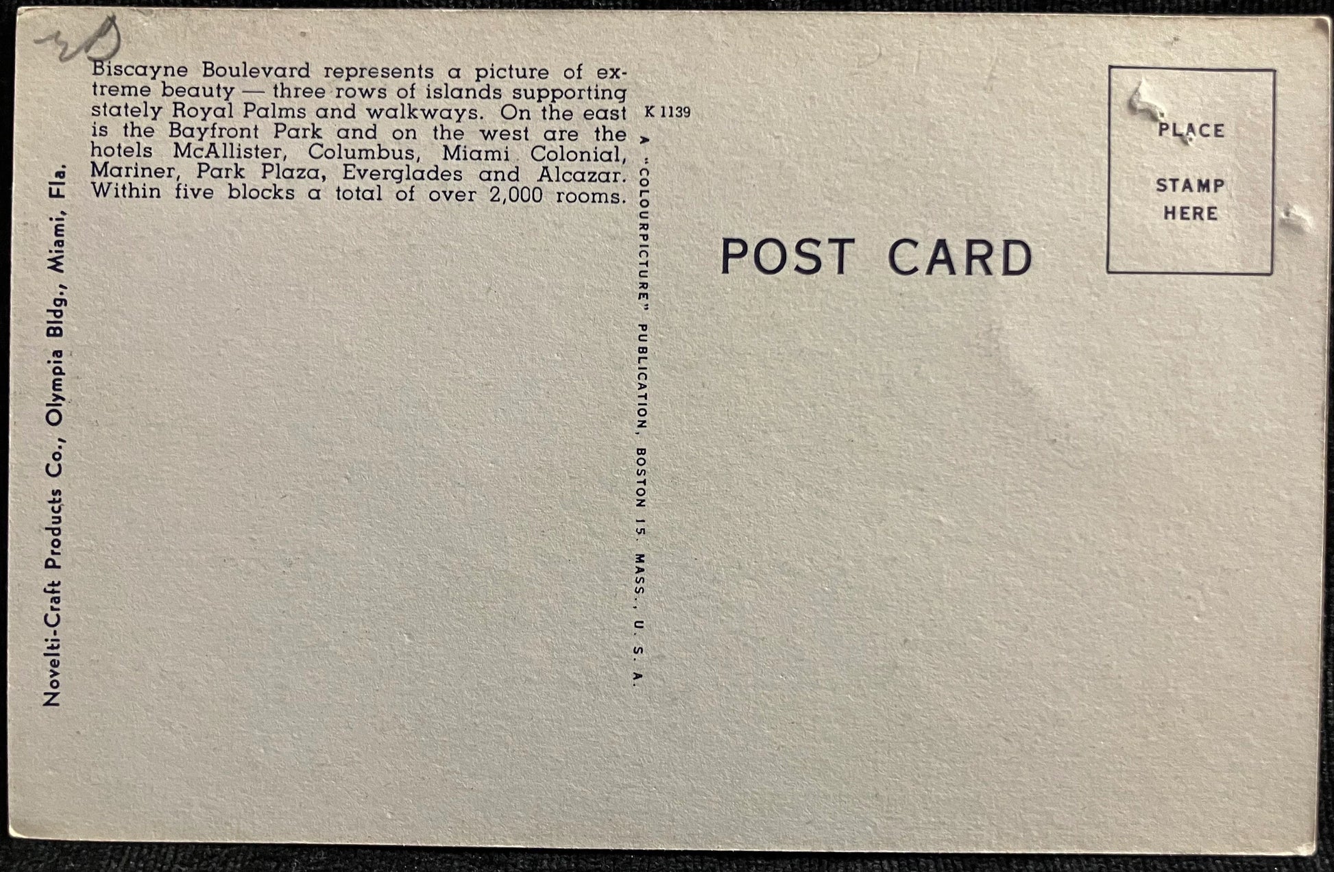 Back: Biscayne Boulevard represents extreme beauty - three rows of islands supporting stately Royal Palms and walkways. On the east is the Bayfront Park and on the west are the hotels McAllister, Columbus, Miami, Colonial, Mariner, Park Plaza, Everglades, and Alcazar. Within five blocks a total of over 2,000 rooms.