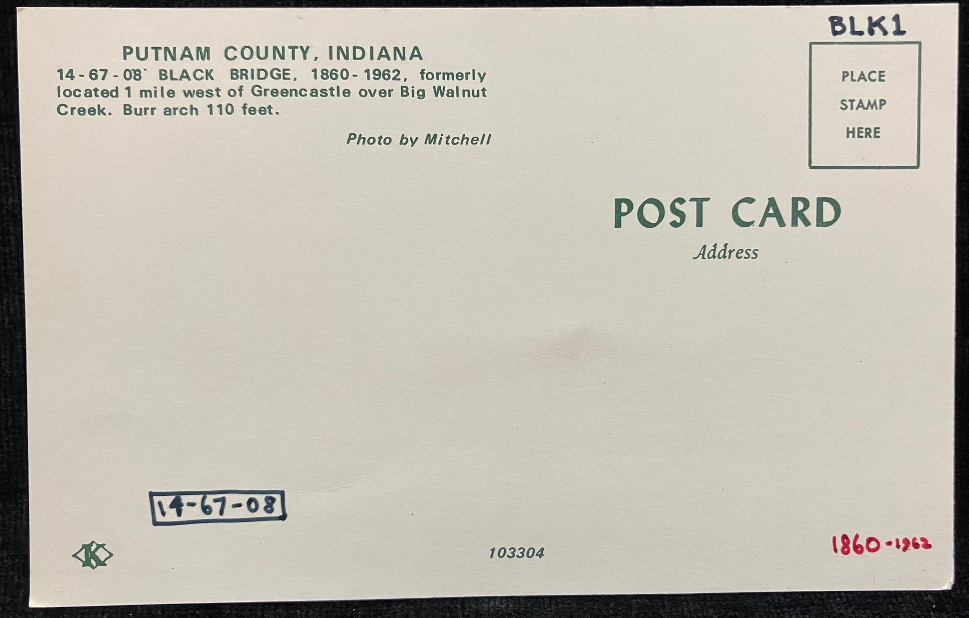 Black Bridge in Putnam County, Indiana - 1860 to 1862 - Photo by Mitchell - Vintage Covered Bridge Postcard