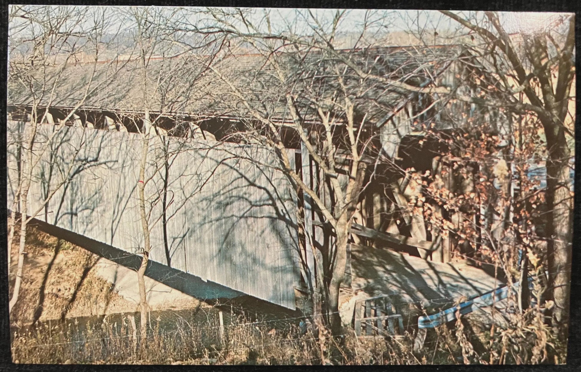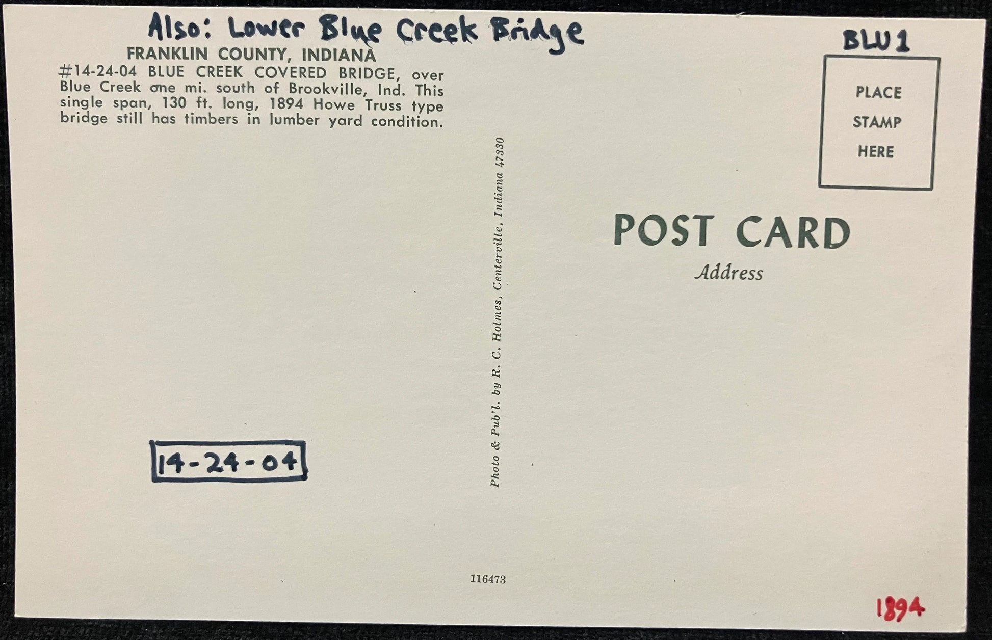 Blue Creek Covered Bridge in Franklin County, Indiana - Lower Blue Creek Bridge - Photo: R. C. Holmes - Vintage Covered Bridge Postcard