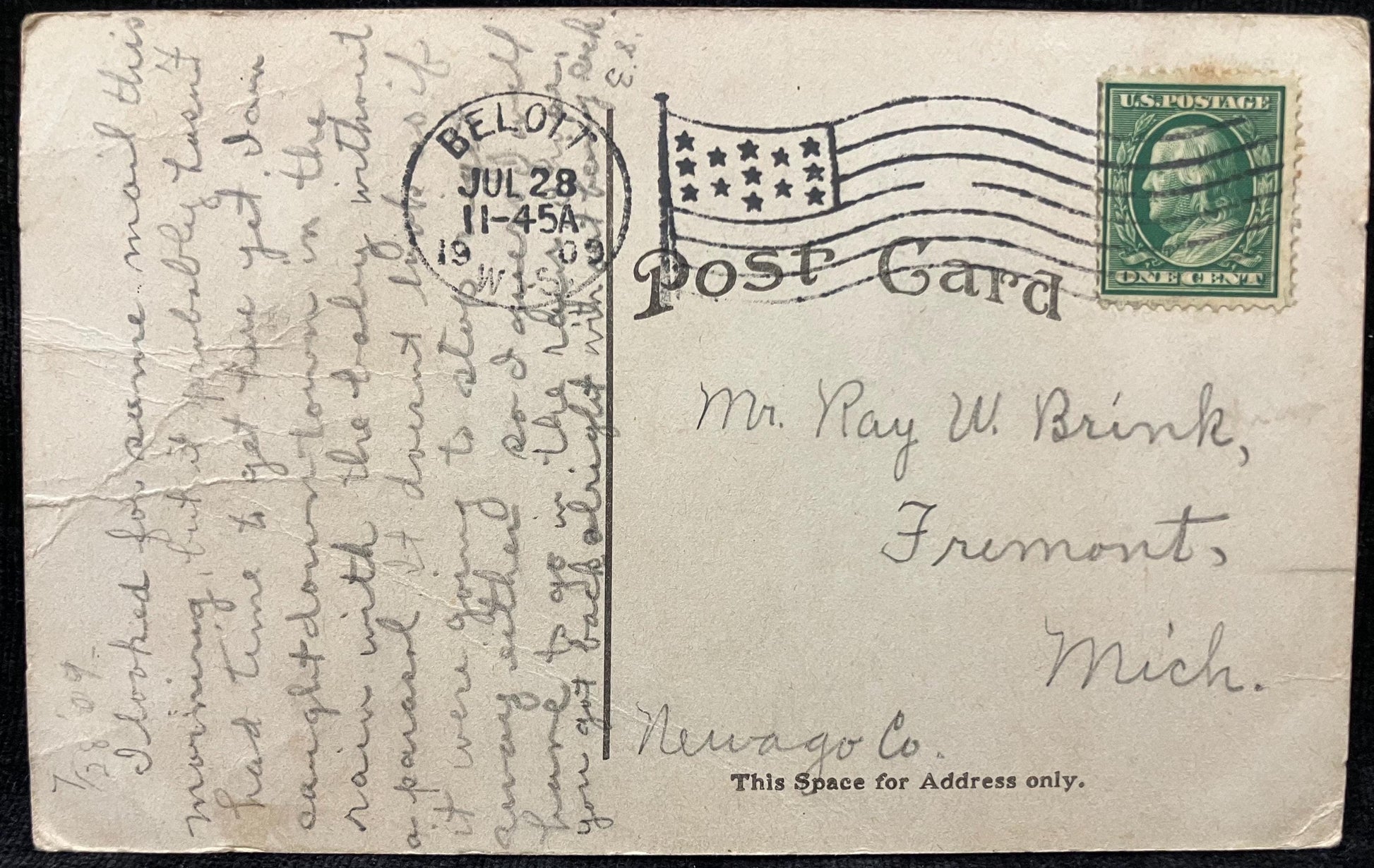 Mailed: Postmark: 1909 green one cent Benjamin Franklin stamp