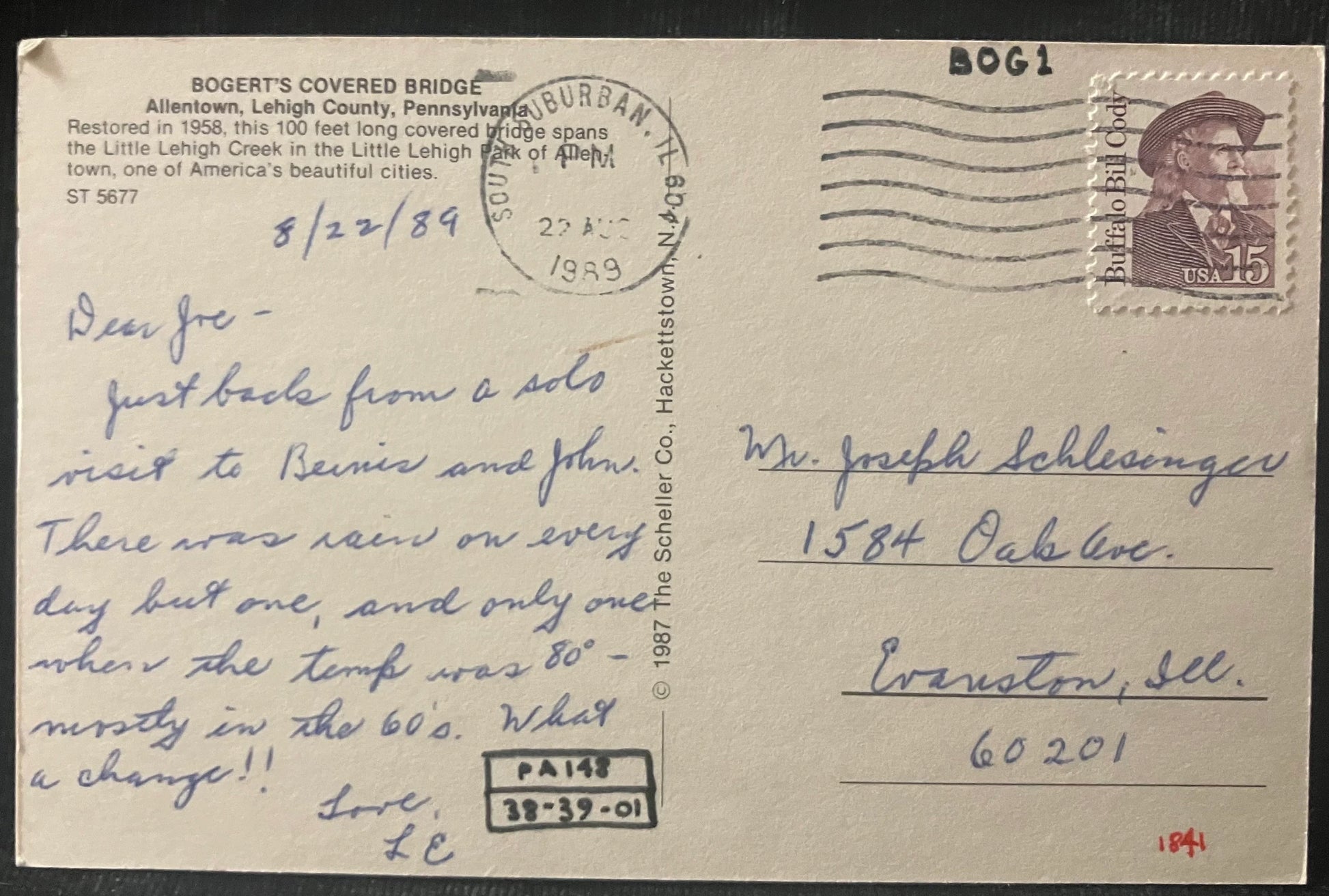 On back: Bogert's Covered Bridge Allentown, Lehigh County, Pennsylvania. Restored in 1958, this 100 feet long covered bridge spans the Little Lehigh Creek in the Little Lehigh Park of Allentown, one of America's beautiful cities.