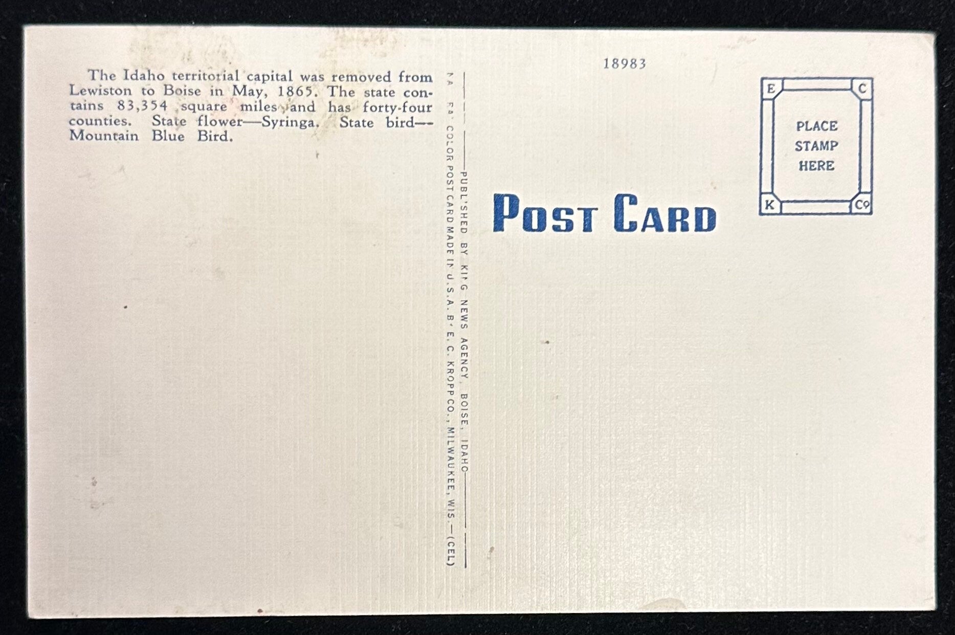 Back Information: The Idaho territorial capital was removed from Lewiston to Boise in May 1865. The state contains 83,354 square miles and has forty-four counties. State flower-Syringa. State bird—Mountain Bluebird.