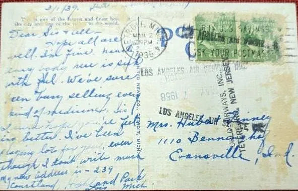 Mailed on March 2, 1939 from Detroit, Michigan, with two green 1-cent George Washington stamps.