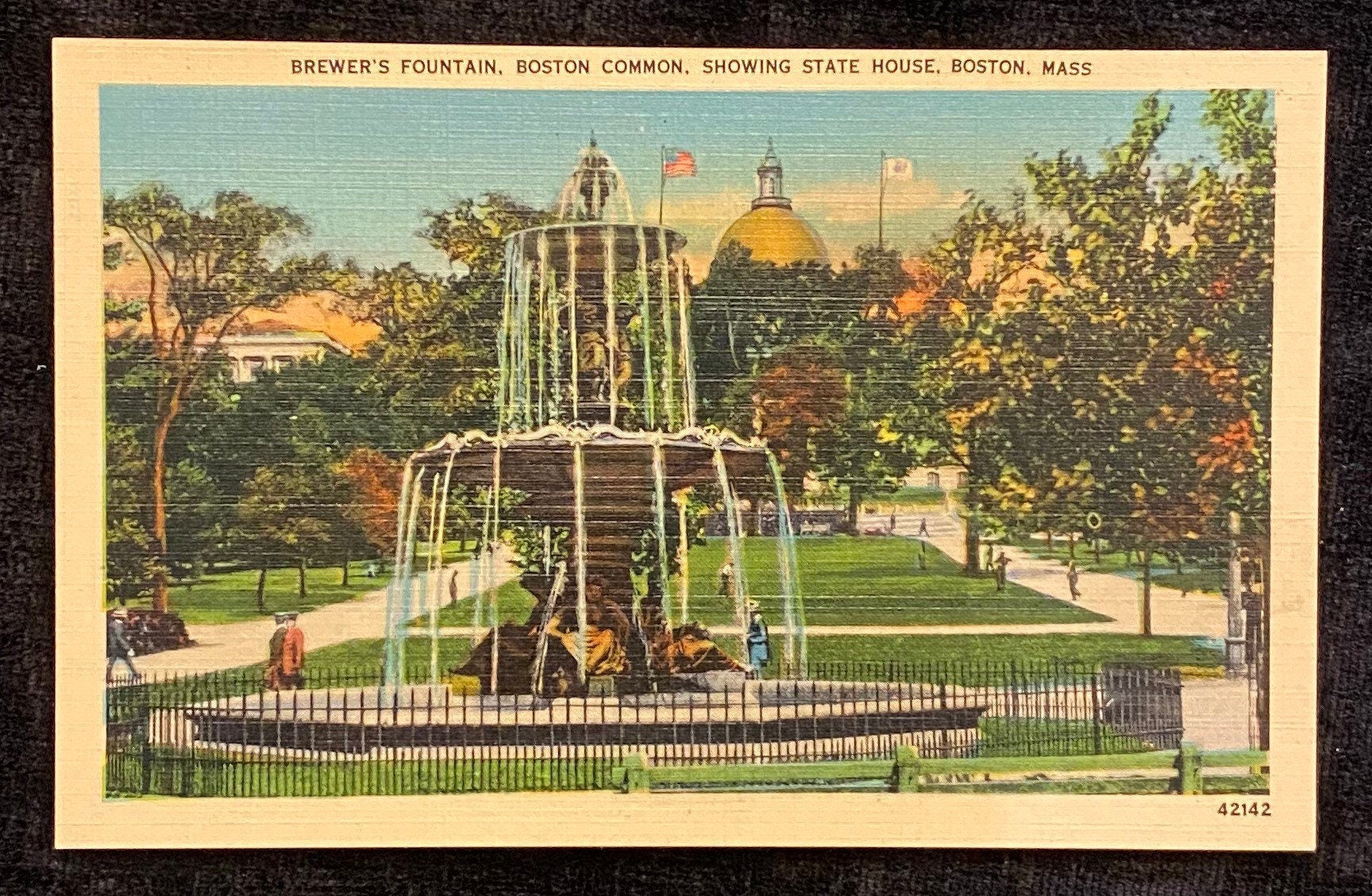Brewer's Fountain - Boston Common - Showing State House - Boston, Massachusetts - 1940s Linen Postcard