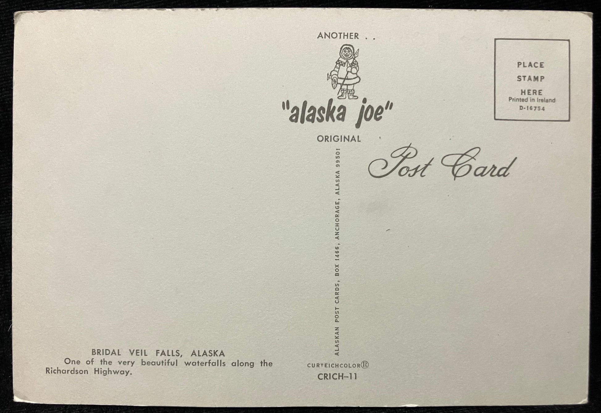On back: Bridal Veil Falls, Alaska. One of the very beautiful waterfalls along the Richardson Highway.